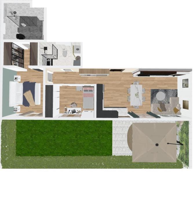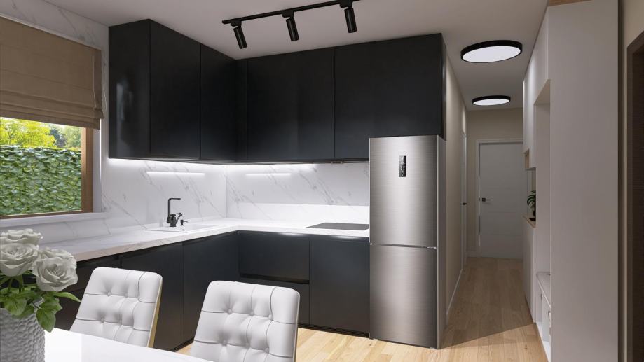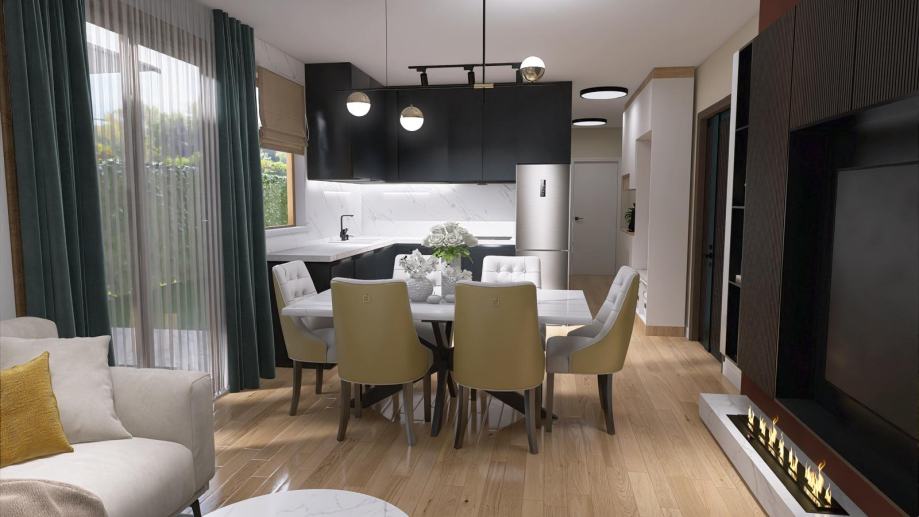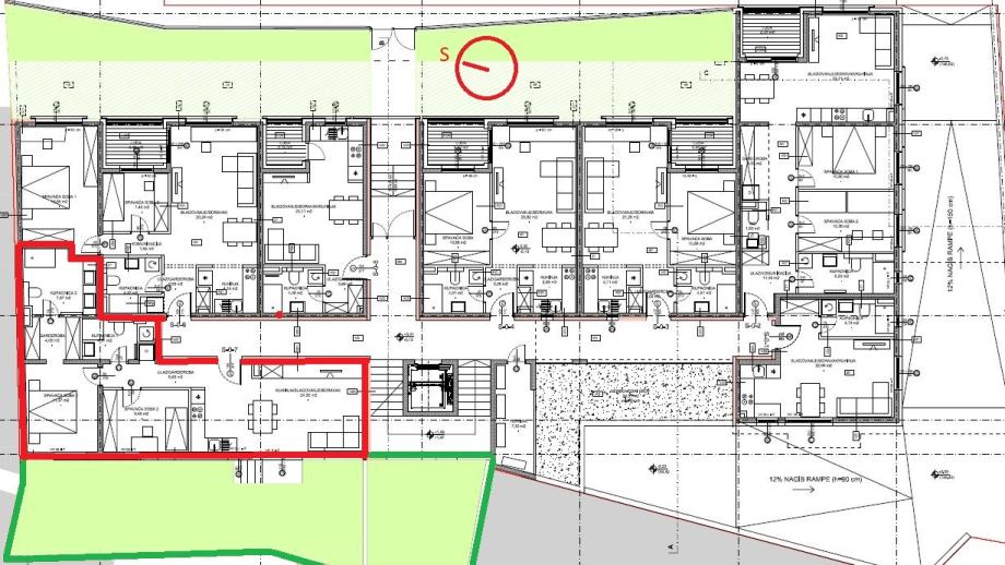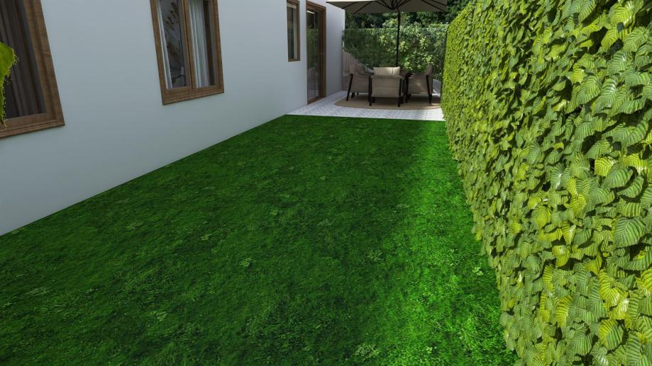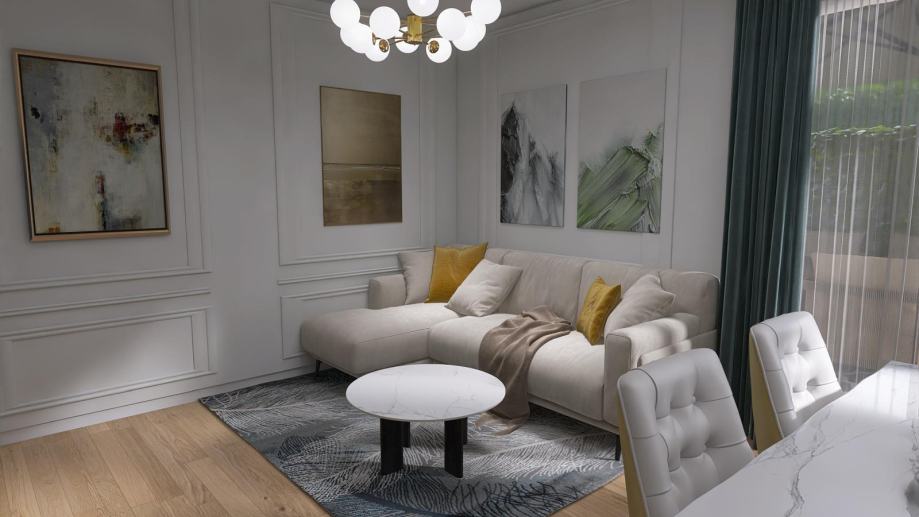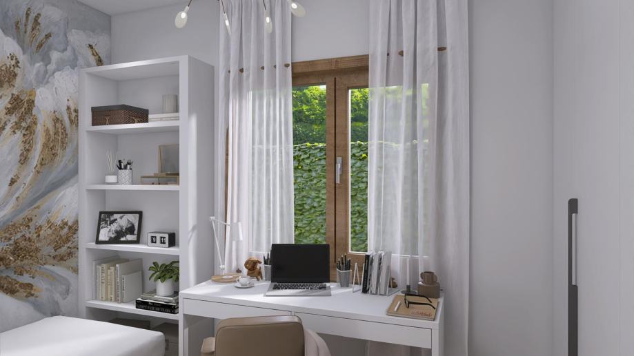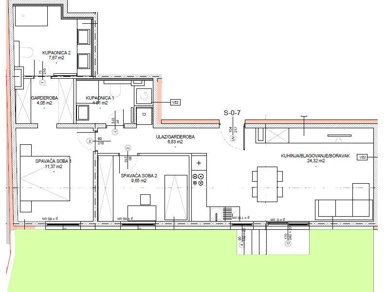 - TROSOBAN stan u prizemlju orijentacije zapad od 74,46m2 koji se sastoji od ulaznog prostora, garderobe, kuhinje, blagovanja i boravka u openspace varijanti, dvije kupaone, dvije spavaće sobe, lođe i vrta.