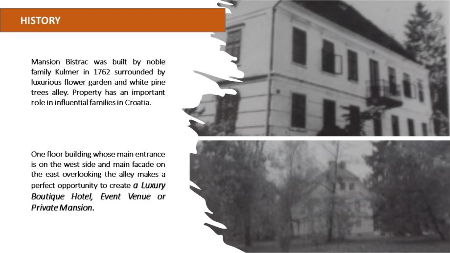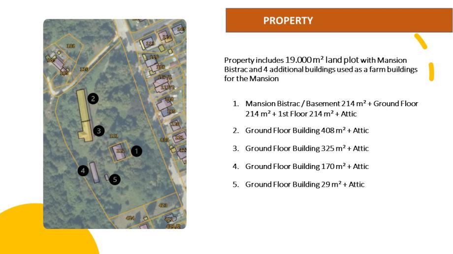 Includes 19.000 m² land plot with Mansion Bistrac and 4 additional buildings used as farm buildings for the Mansion: