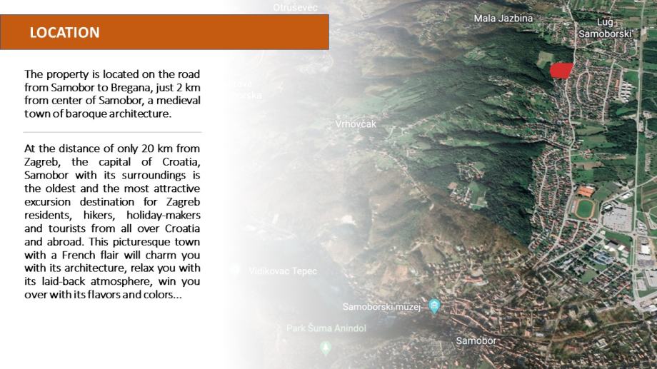 This unique property is located on the west side of the road from Samobor to Bregana just 2 km from Samobor's old town square, surrounded by forests.