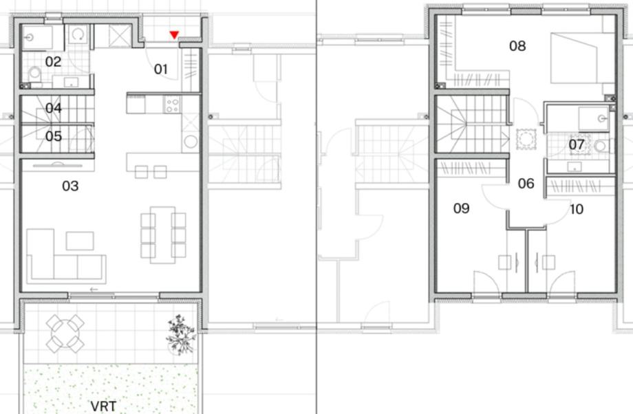 Prizemlje: ulazni hodnik, open-space dnevni boravak s blagovaonicom i kuhinjom, kupaonica, izlaz na terasu i vrt.