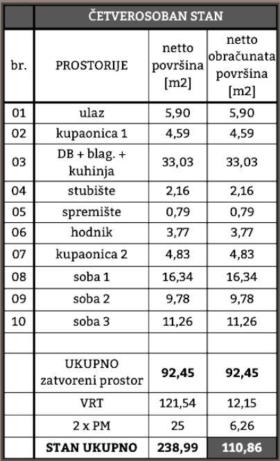 Proteže se na prizemlje i 1. kat, ukupne neto obračunate površine 110,86 m².