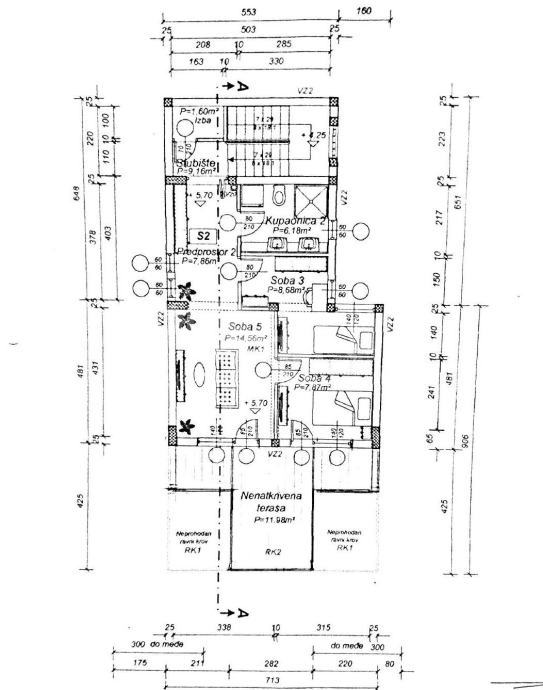 Zgrada se sastoji od svega 2 stana. Svaki stan ima svoju garažu u prizemlju objekta površine 16m2, te jedno vanjsko parkirno mjesto.