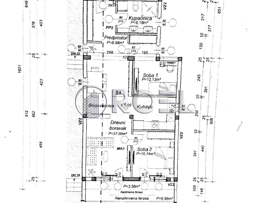 U prizemlju se nalazi trosoban stan ukupne neto površine 86 m2, a sastoji se od: ulaznog hodnika, kupaonice, dvije spavaće sobe, kuhinje, blagovaonice, natkrivene i nenatkrivene terase.Svi finalni radovi (keramika, LVT, sobna vrata i završno farbanje u dogovoru s kupcem što povećava cijenu za 8.000 EUR-a)