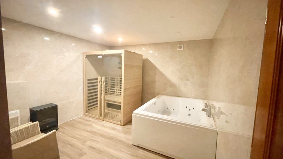 On the ground floor there is: a meeting room with a covered access to the pool (outdoor showers next to the pool), a bathroom with a shower and toilet, a sauna and a jacuzzi.