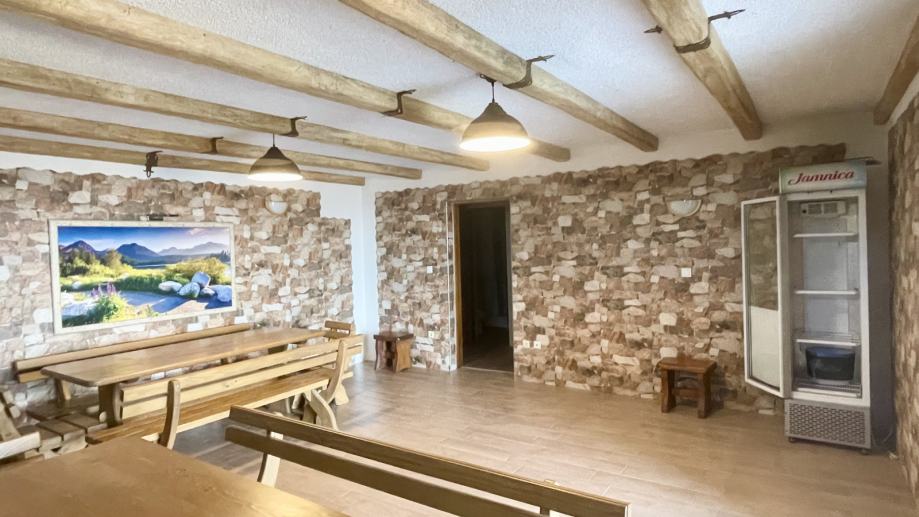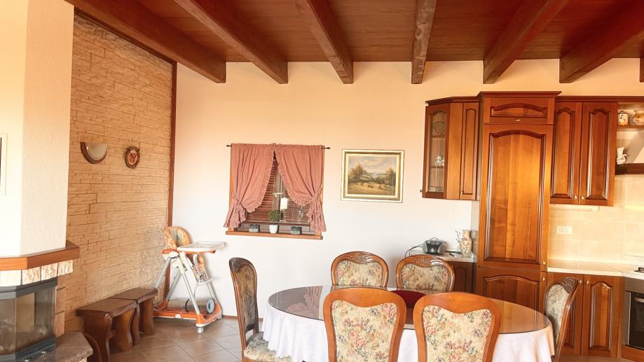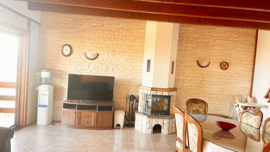 Gornja etaža se sastoji od: ulaza, kupaona s wc-om i tuš kabinom, prostrana dnevna soba s kuhinjom te kaminom, izlazom na natkrivenu terasu.