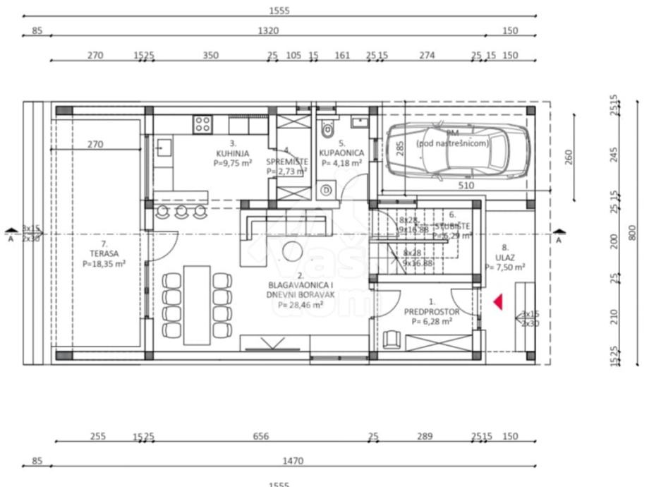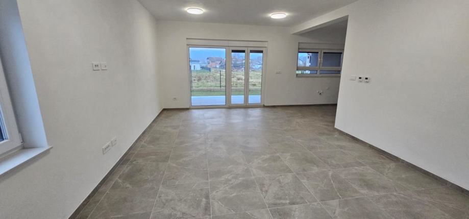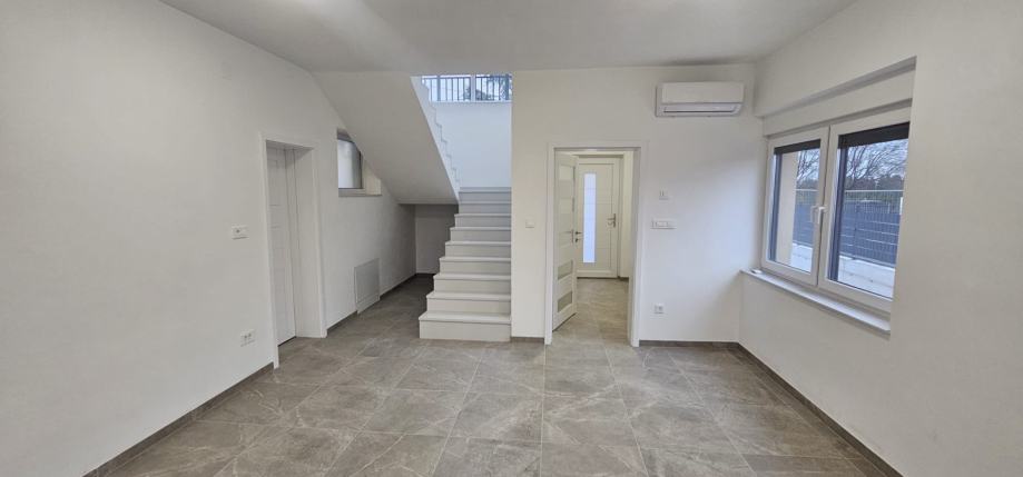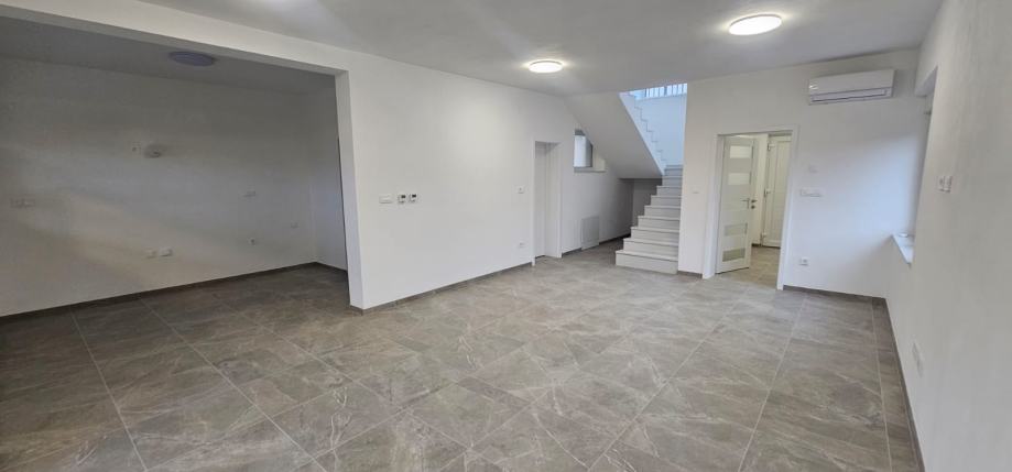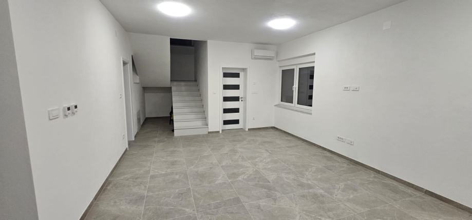 Kuća je koncipirana na dva kata, u prizemlju je kupaonica, ostava, kuhinja i dnevni boravak iz kojeg se izlazi na veću terasu 18 m2 .