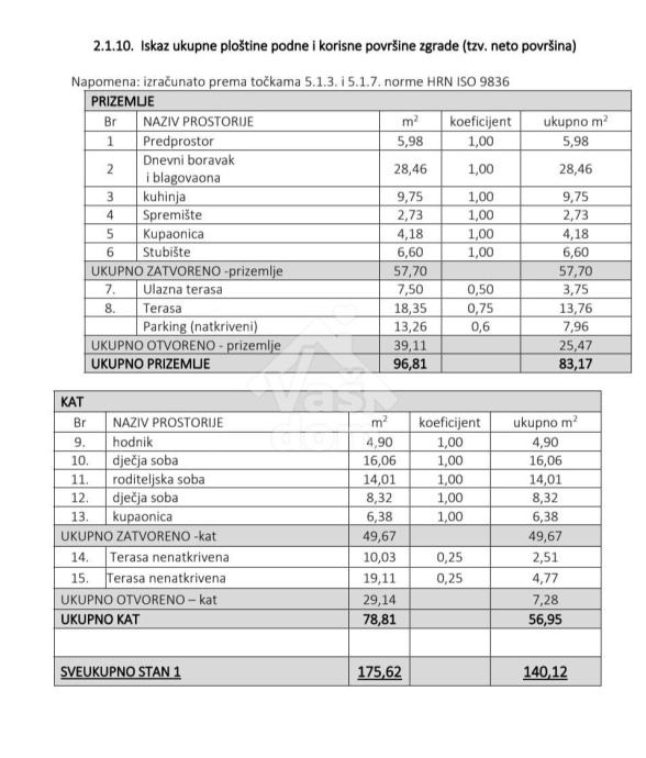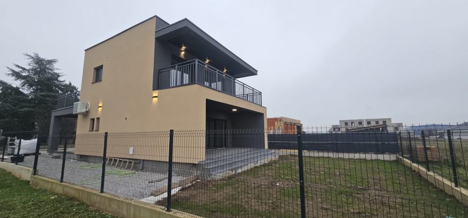Kuća je ukupne neto korisne površine 140 m2 + 250 m2 , ukupno 165 m2 s dva parkirna mjesta od kojeg je jedno natkriveno u sklopu kuće i drugo vanjsko .