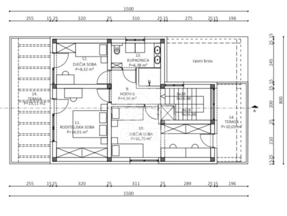Na katu se nalaze tri prostrane sobe od koje dvije imaju izlaz na veliku terasu , garderobe i kupaonice te druge manje terase.