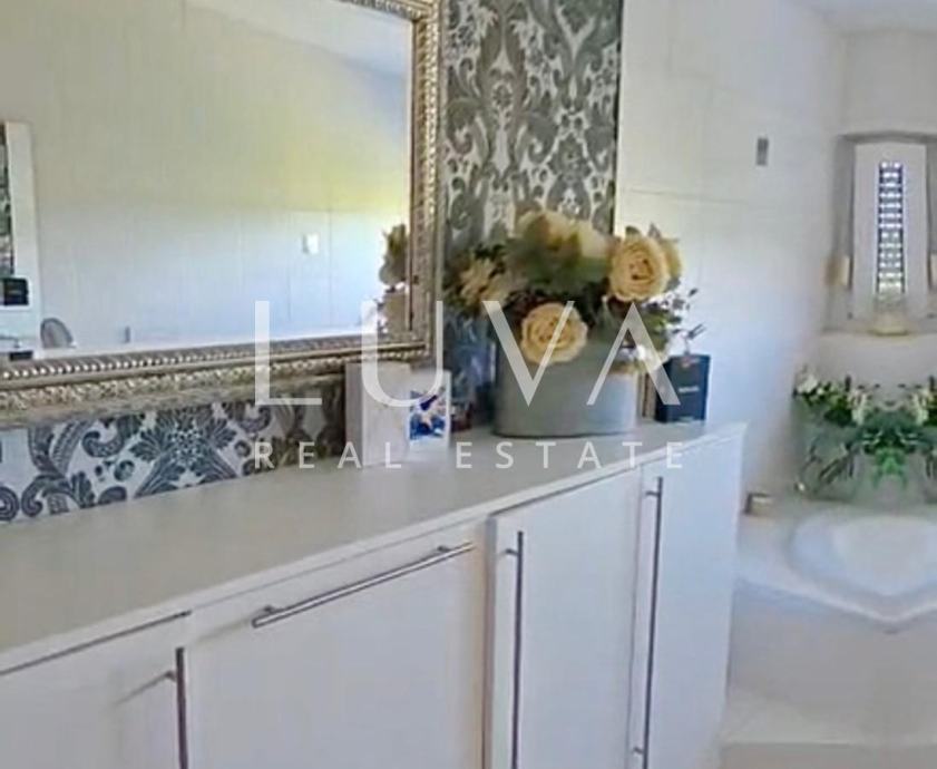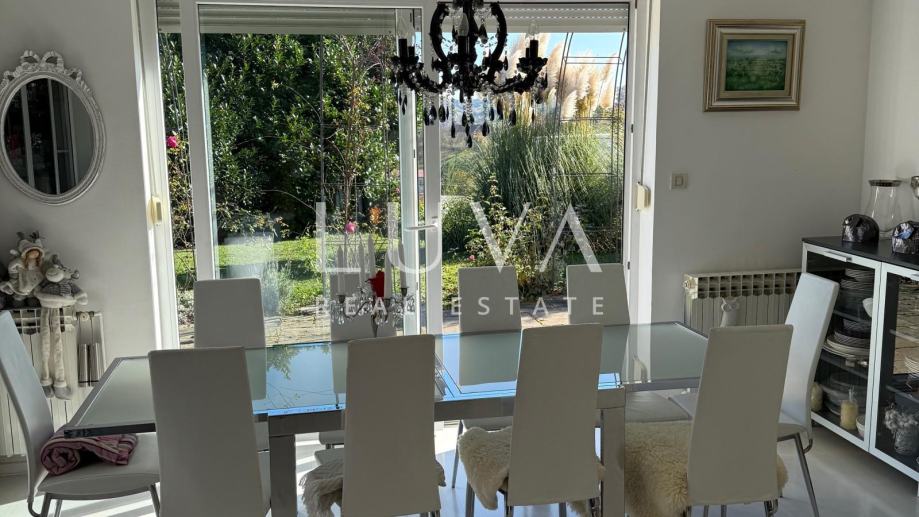 Prostrani dnevni boravak koji se kroz staklene stijene otvara prema terasama i zelenilu stvara harmoniju interijera i eksterijera, nudeći luksuznu prozračnost i maksimalan komfor, a kuhinja se u svom otvorenom konceptu savršeno nadovezuje na blagovaonicu, stvarajući fluidan i funkcionalan prostor idealan za svakodnevni život i druženja. Iz svih prostorija može se izaći u bajkoviti, prostrani vrt.