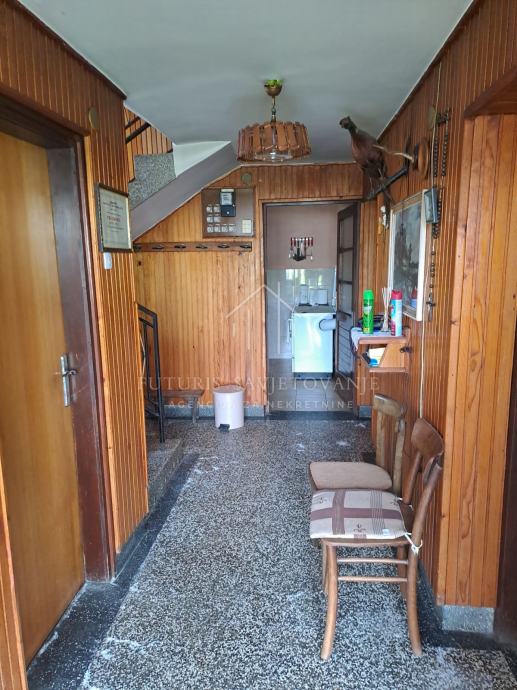 kuhinja, kupaonica, hodnik i pomoćna prostorija. Na katu se nalaze četiri sobe i