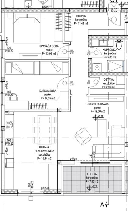 Sastoji se od hodnika, dvije spavaće sobe, jedne kupaonice, ostave, dnevnog boravka i blagovaone te kuhinje i loggie.