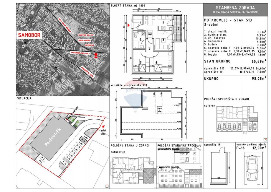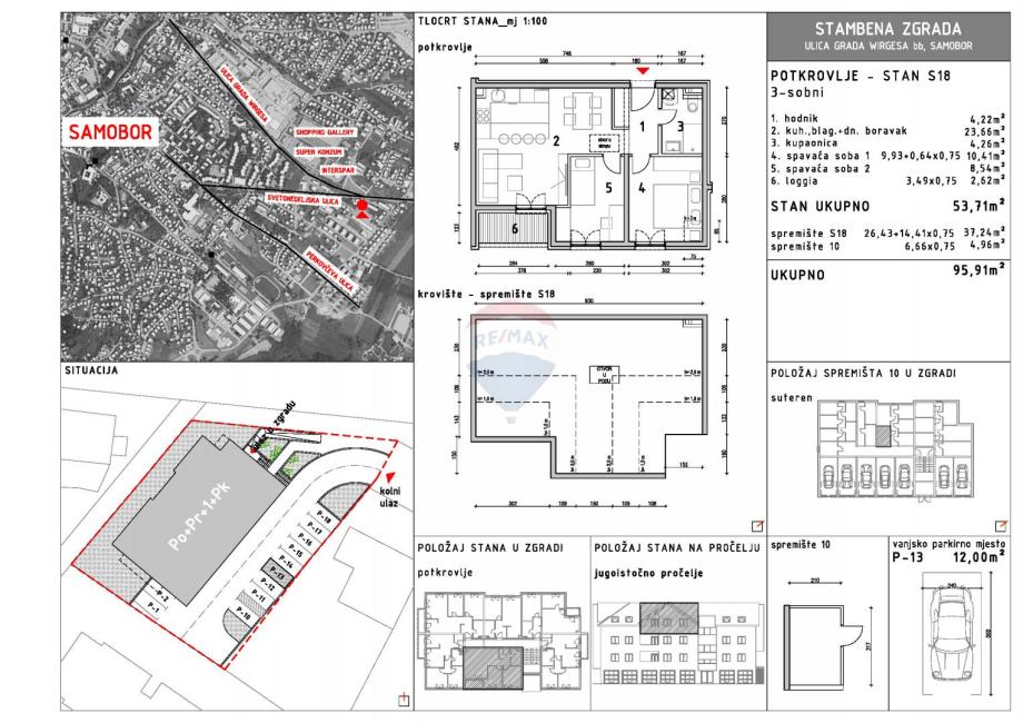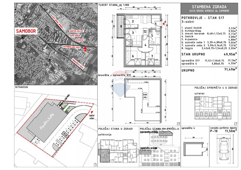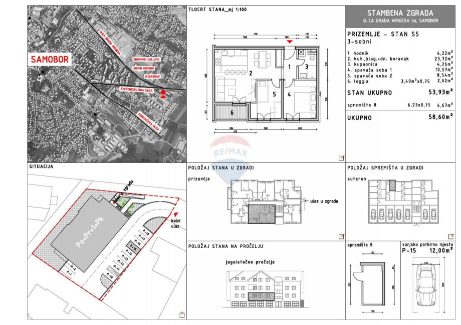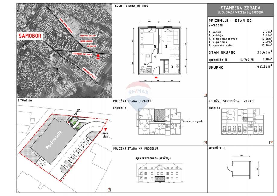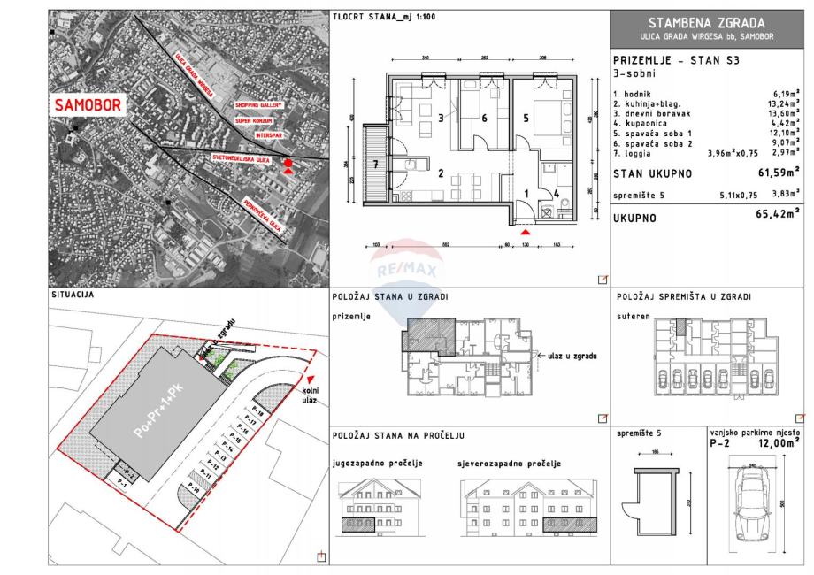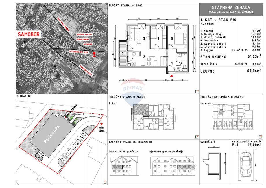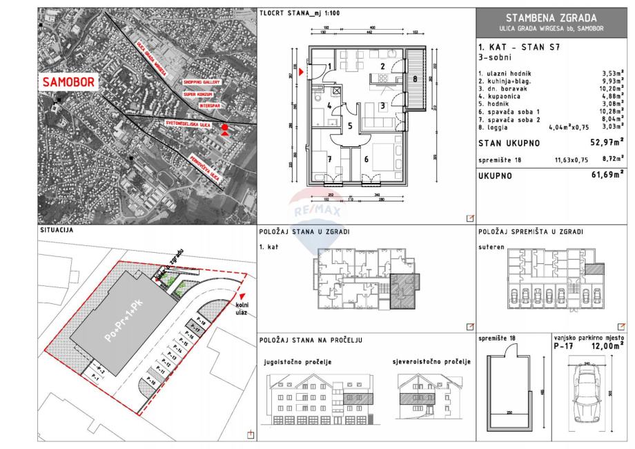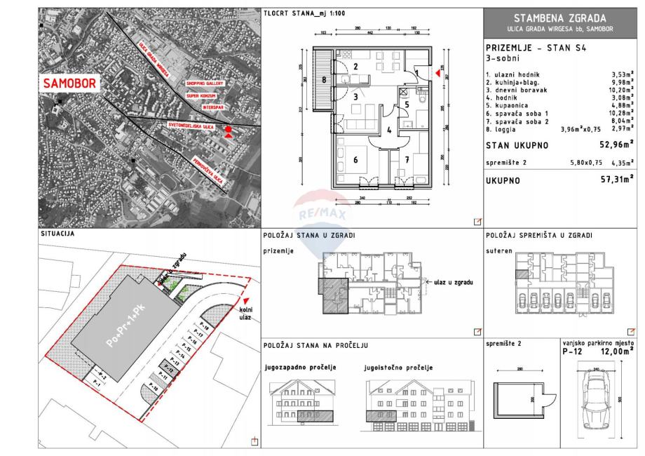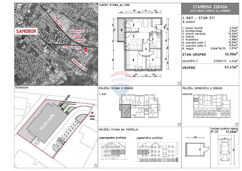 Trosoban stan S8 se nalazi u sklopu projekta novogradnje, u blizini svih sadržaja koji su važni za ugodan život (autobusne stanice, osnovne škole, Crkva, Shopping Gallery Samobor, Interspar, Konzum, Kaufland, Sajmište Samobor…). Nalazi se na 1.katu zgrade koja se sastoji od suterena, visokog prizemlja, 1.kata i potkrovlja.