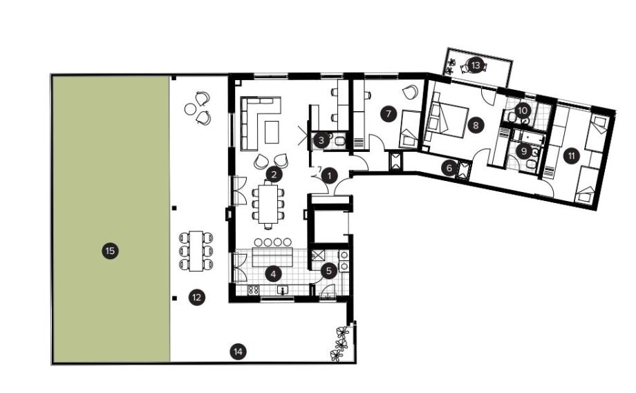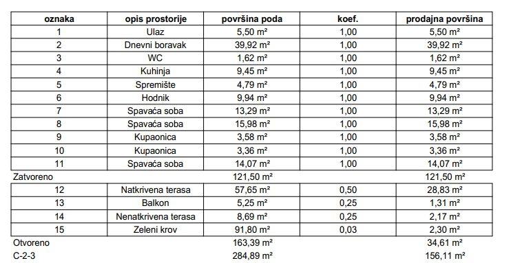 Stan će se nalaziti na drugom katu zgrade, ukupne prodajne površine 156,11 m² (ukupna neto površina poda iznosi 284,89 m²), a sastoji se od ulaznog prostora, open-space dnevnog boravka s blagovaonicom, kuhinje, tri spavaće sobe, dvije kupaonice, zasebnog WC-a, hodnika, nenatkrivene terase, balkona i spremišta.
