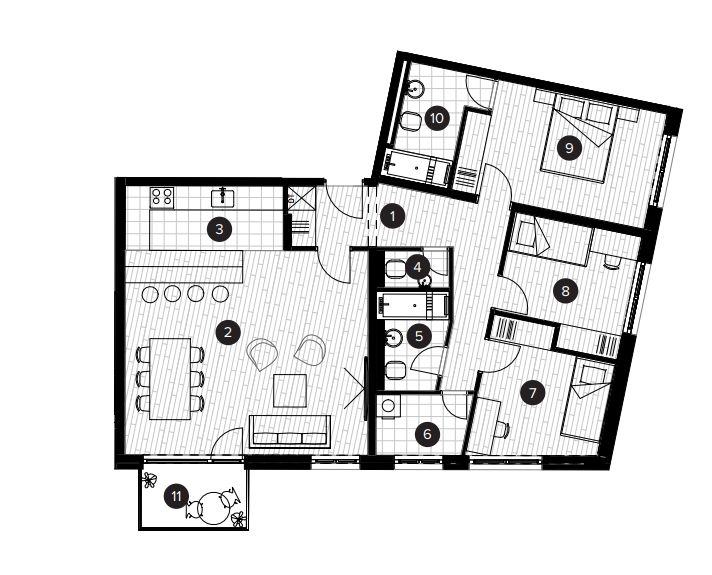 Stan će se nalaziti na prvom katu zgrade, ukupne prodajne površine 93,63 m² (ukupna neto površina poda iznosi 96,64 m²), a sastoji se od ulaznog prostora, open space dnevnog boravka s blagovaonicom, kuhinje, tri spavaće sobe, kupaonice, zasebnog WC-a, balkona i spremišta.