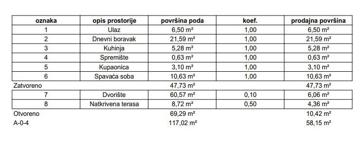 Stan će se nalaziti u prizemlju zgrade, ukupne prodajne površine 58,15 m² (ukupna neto površina poda iznosi 117,02 m²), a sastoji se od ulaznog prostora, open space dnevnog boravka s blagovaonicom i kuhinjom, spavaće sobe, kupaonice, natkrivene terase, dvorišta i spremišta.