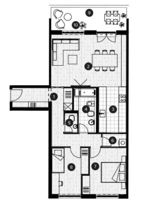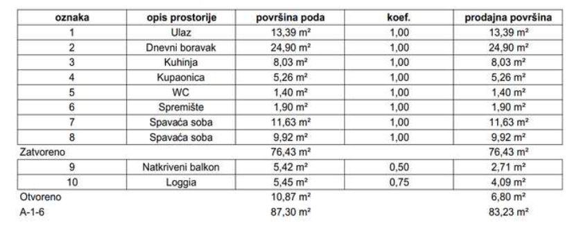 Stan će se nalaziti na drugom katu zgrade, ukupne prodajne površine 83,07 m² (ukupna neto površina poda iznosi 91,53 m²), a sastoji se od ulaznog prostora, open-space dnevnog boravka s blagovaonicom, kuhinje, dvije spavaće sobe, kupaonice, zasebnog WC-a, balkona, dvije loggie s obje strane stana i spremišta.