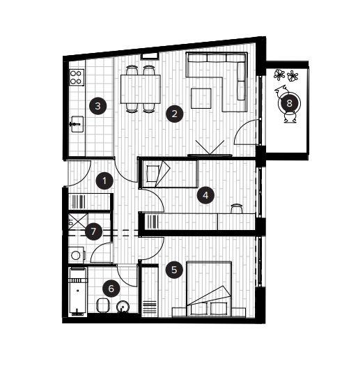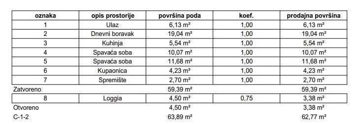 Stan će se nalaziti na prvom katu zgrade, ukupne prodajne površine 62,77 m² (ukupna neto površina poda iznosi 63,89 m²), a sastoji se od ulaznog prostora, open space dnevnog boravka s blagovaonicom, kuhinje, dvije spavaće sobe, kupaonice, loggie i spremišta.