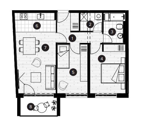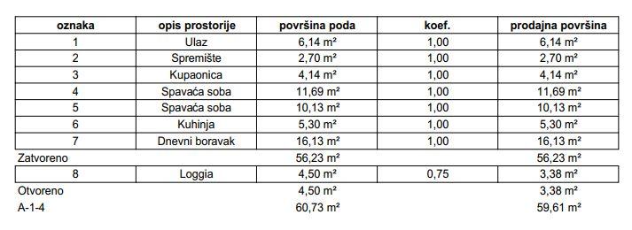 Stan će se nalaziti na prvom katu zgrade, ukupne prodajne površine 59,61 m² (ukupna neto površina poda iznosi 60,73 m²), a sastoji se od ulaznog prostora, open space dnevnog boravka s blagovaonicom i kuhinjom, dvije spavaće sobe, kupaonice, loggie i spremišta.