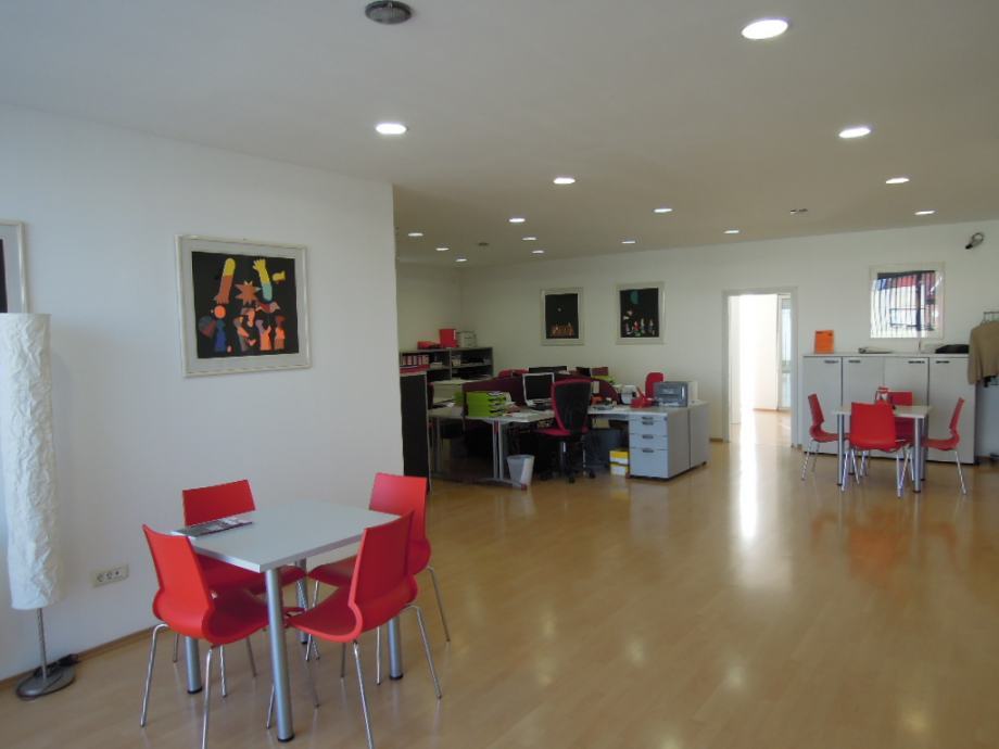 I. kat: ulaz sa stubišta, veći prostor (trenutno ured sa 6 radnih mjesta i 2 stola za stranke, dvije odvojene kancelarije, te sanitarni čvor sa čajnom kuhinjom. Na podu je laminat, strop je «Knauf» sa ugrađenom kvalitetnom rasvjetom, klimatizirano.