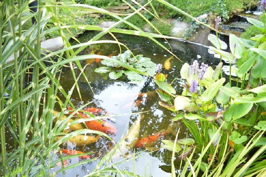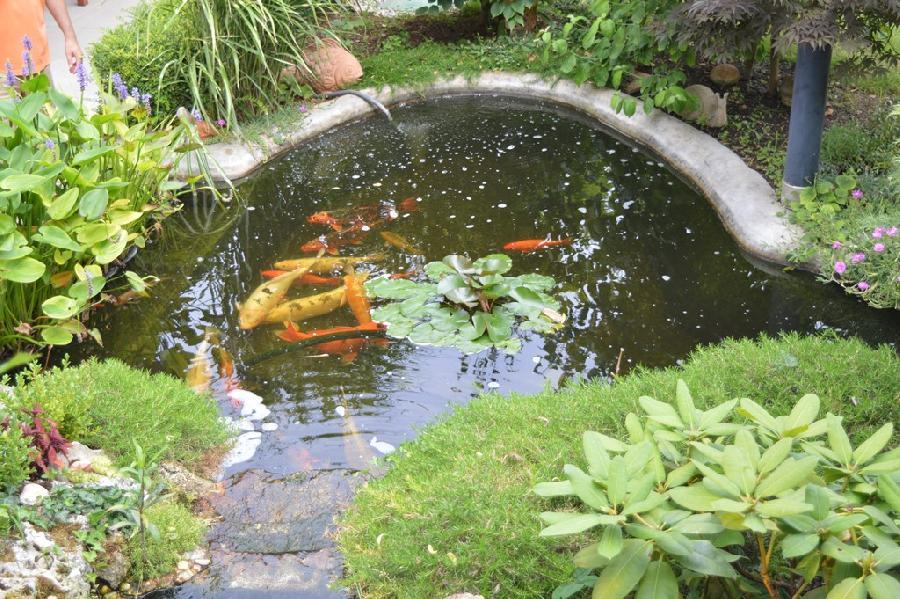 U vrtu se nalazi fontana s ribama ( ( Koi ribe ).