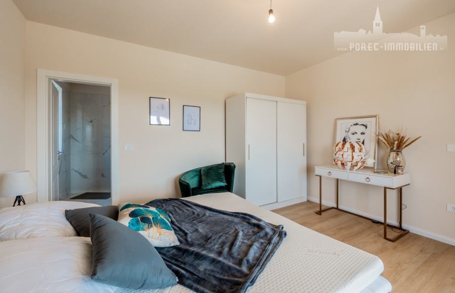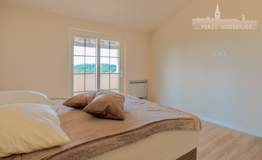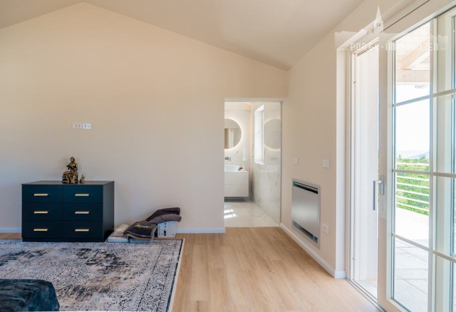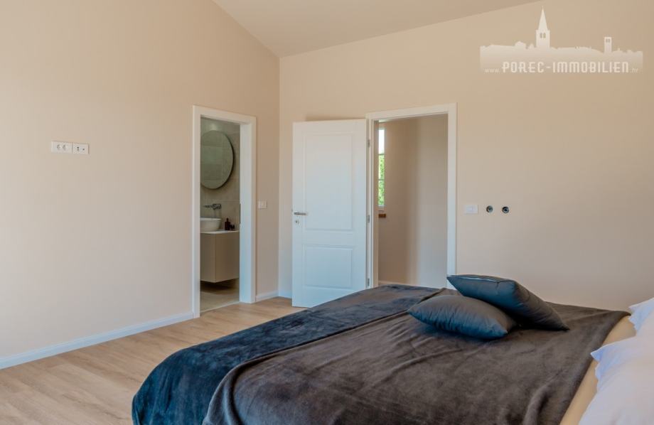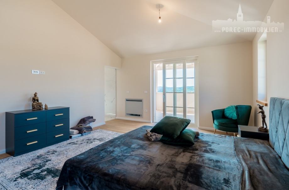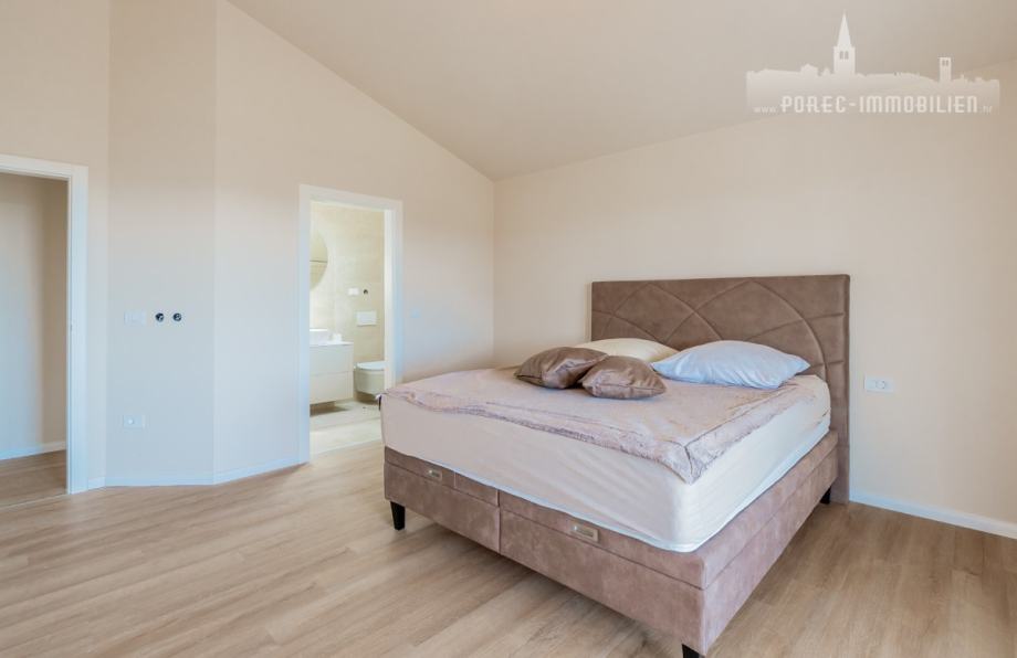 Na katu se nalaze 3 velike spavaće sobe, svaka sa svojom kupaonicom i balkonom. Grijanje u kući je predviđeno podno i putem fan coilera, isto kao i hlađenje.