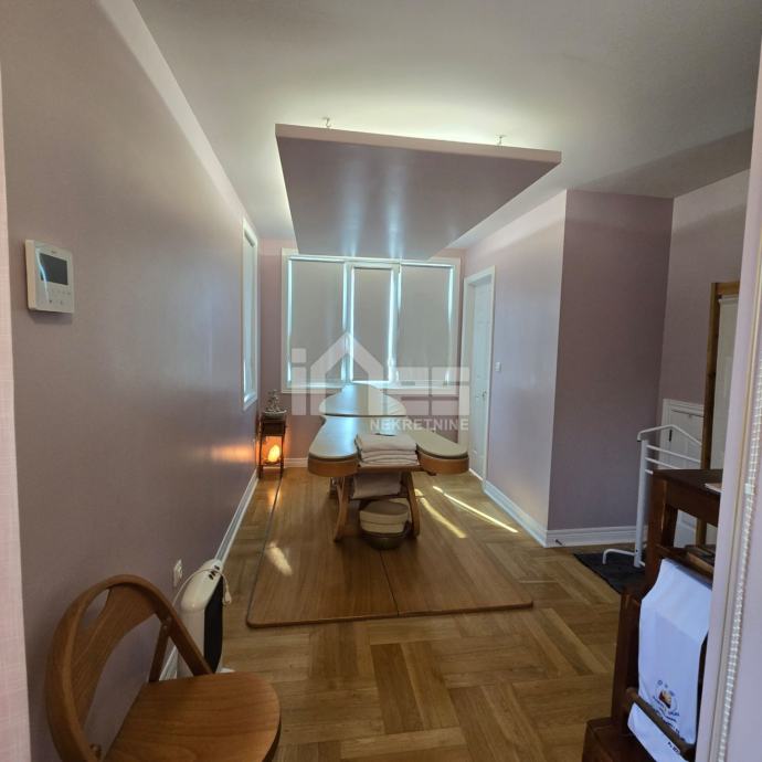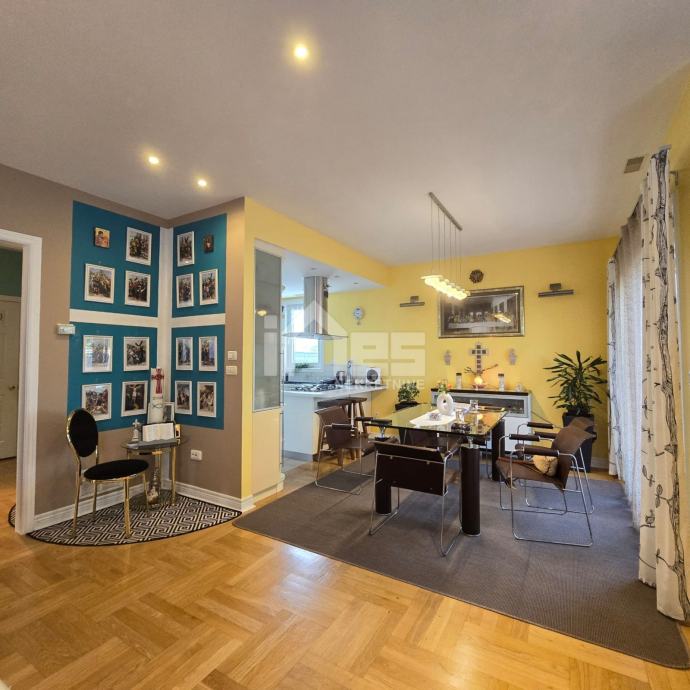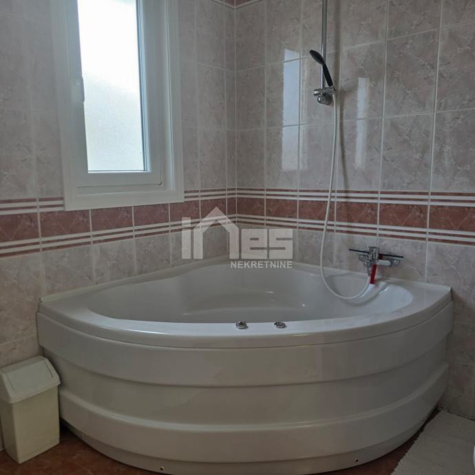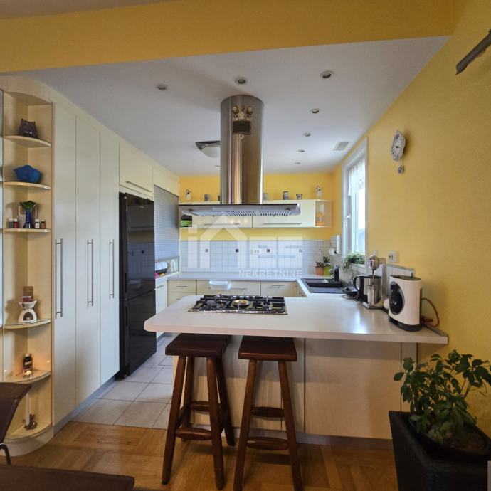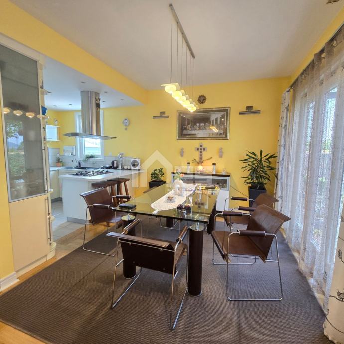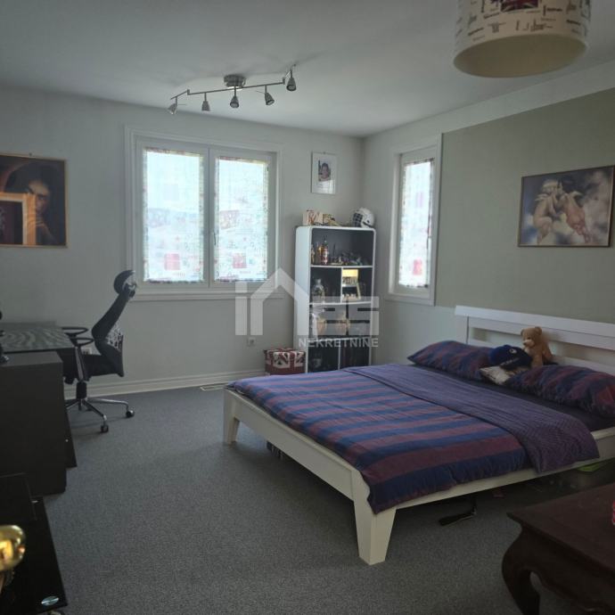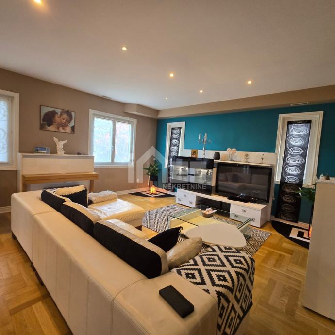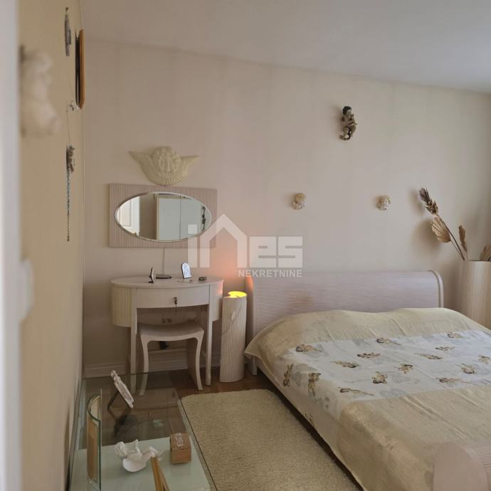 Stambena površina od 240 m² prostire se na dvije etaže i uključuje pet prostranih spavaćih soba, tri kupaonice (od kojih je jedna uređena kao mala Spa-zona s masažnom tuš-kabinom i saunom), prostrani dnevni boravak s blagovaonicom i moderno opremljenom kuhinjom. Svaka prostorija je okupana prirodnim svjetlom zahvaljujući velikim prozorima, a posebna pažnja posvećena je uređenju detalja i stvaranju prostora koji poziva na boravak.