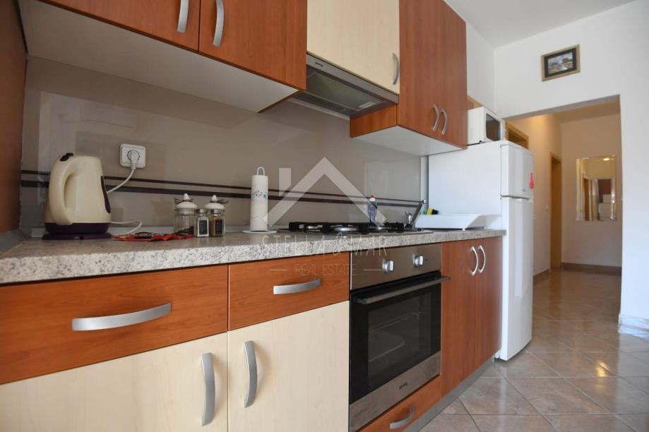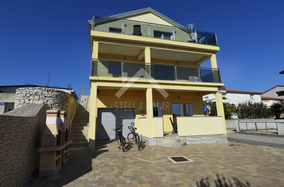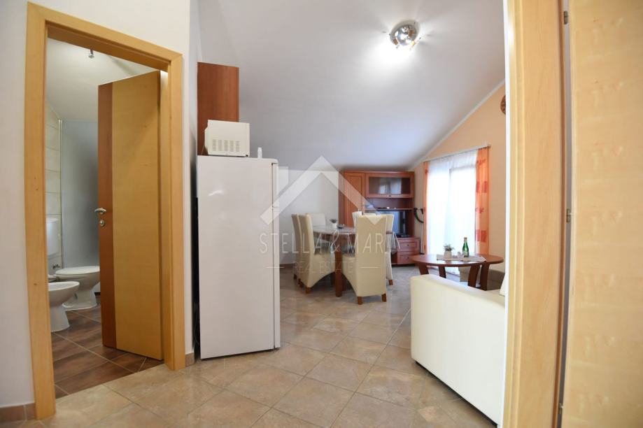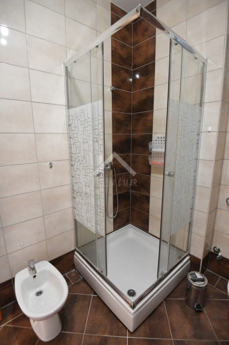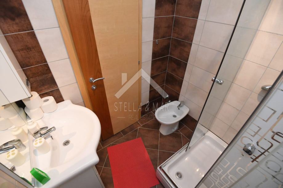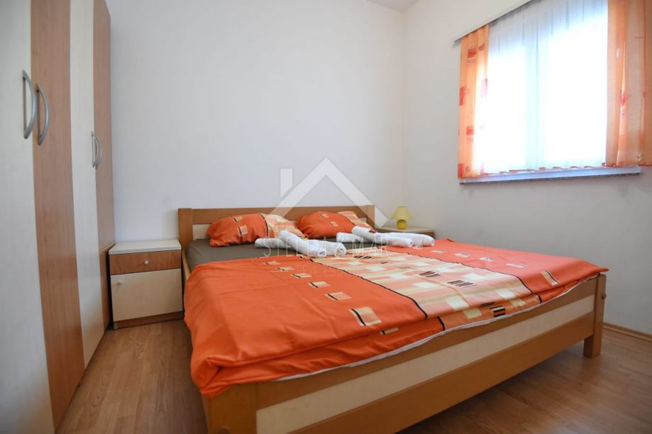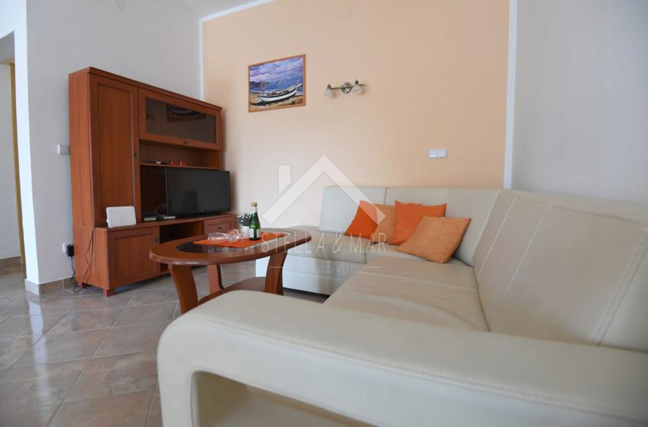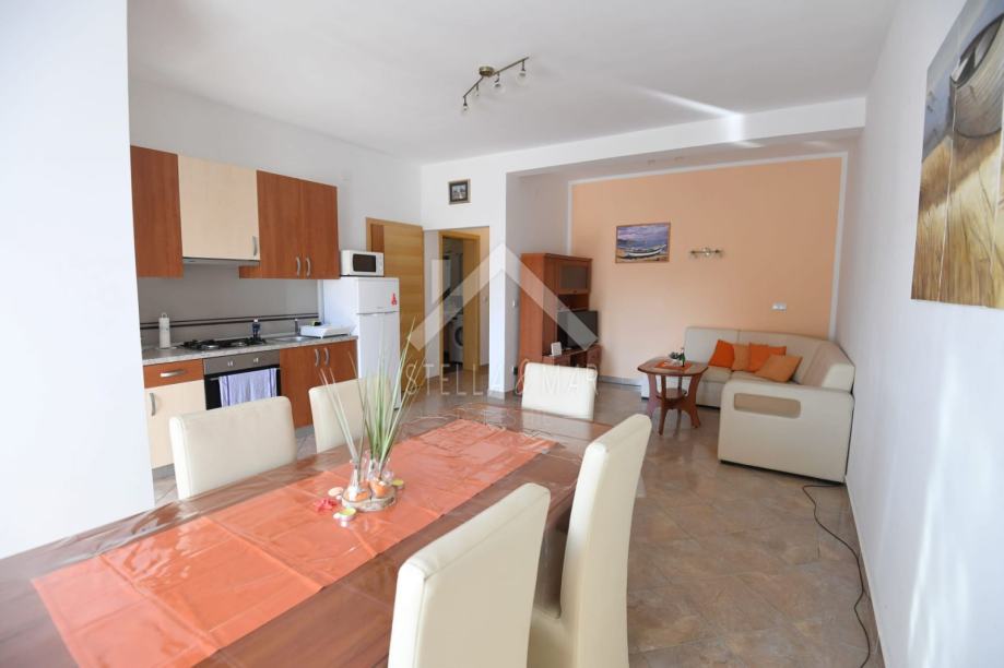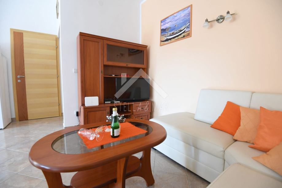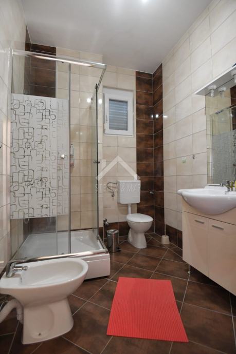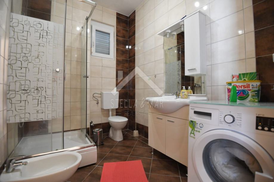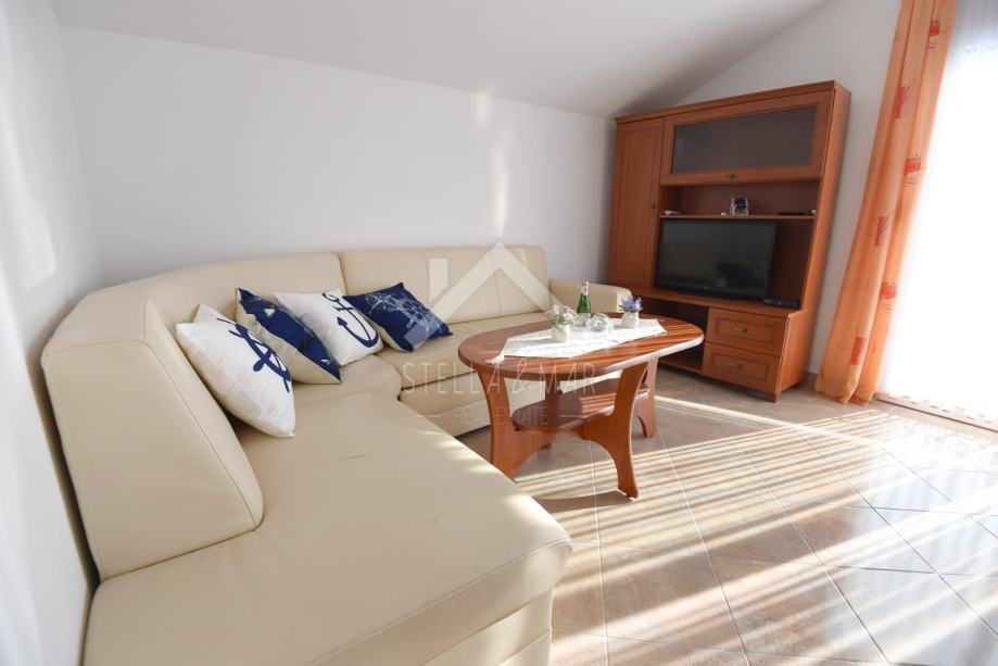 U prizemlju se nalazi prostrani dvosobni apartman površine cca 65m2 koji raspolaže sa dnevnim boravkom, kuhinjom, blagovaonom, dvije spavaće sobe, dvije kupaone i natkrivenom terasom. U prizemlju se nalazi i garaža.