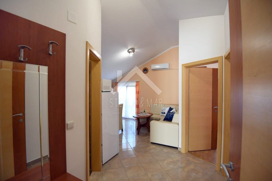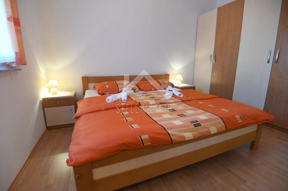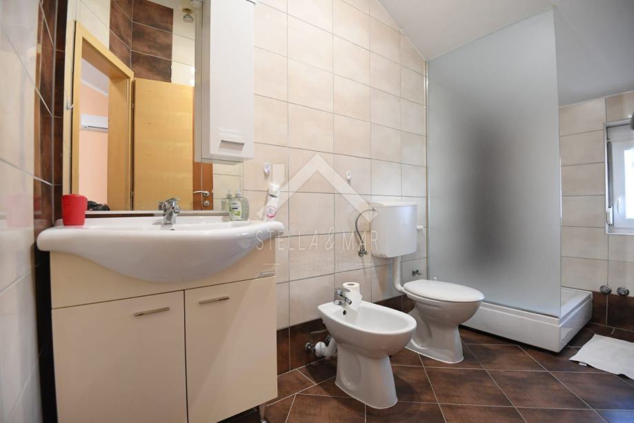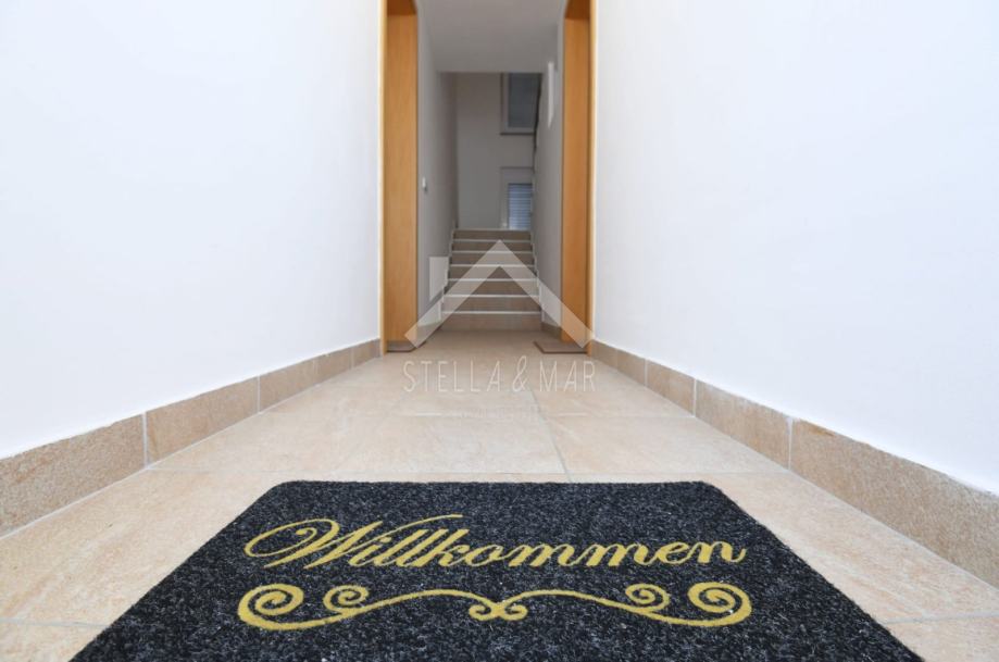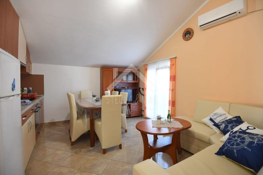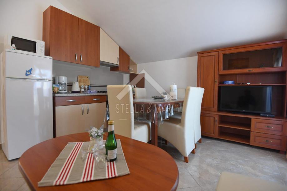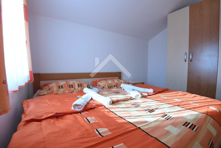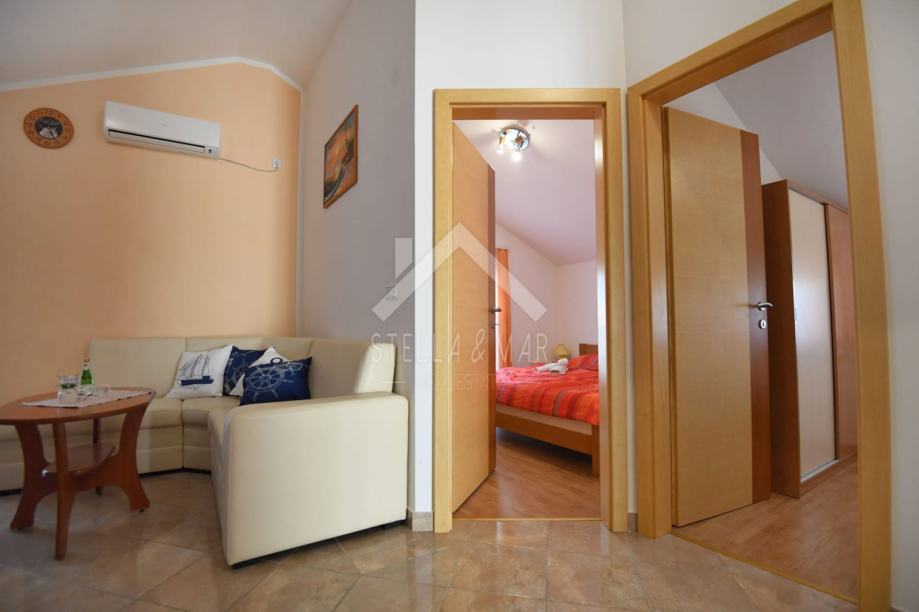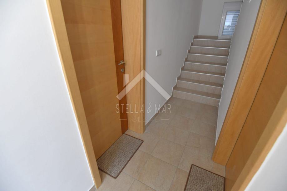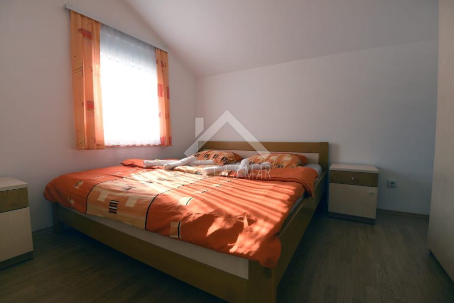 Stepenice vode na kat gdje su smještena dva apartmana površine cca 40-45m2. Jednosobni apartman raspolaže sa dnevnim boravkom, kuhinjom, blagovaonom, spavaćom sobom , kupaonom i natkrivenom terasom površine 16m2. Dvosobni apartman raspolaže sa dvije spavaće sobe, dnevnim boravkom, kuhinjom, blagovaonom i kupaonom.