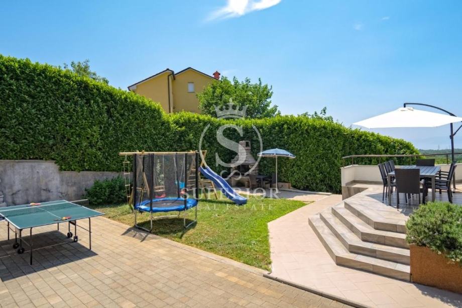 Okućnica je pažljivo uređena i nudi sve za potpuni užitak – bazen, sunčalište, dječje igralište, roštilj, vrt, voćnjak i dvije garaže uz dodatna parkirna mjesta. Terasa od 120 m² poziva na druženja i opuštanje.