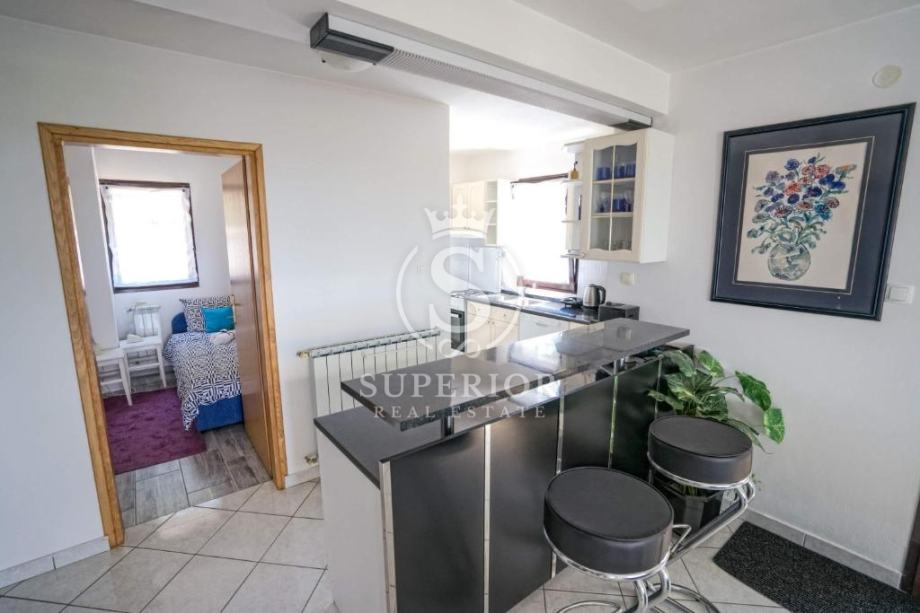 Prizemlje: prostrani dnevni boravak sa šankom, kuhinja, blagovaonica, ostava, spavaća soba i kupaonica