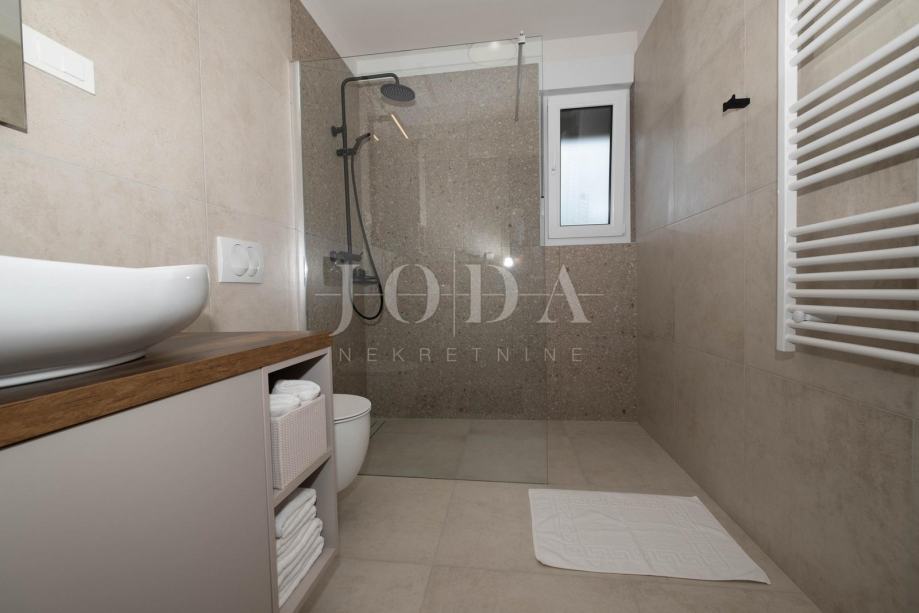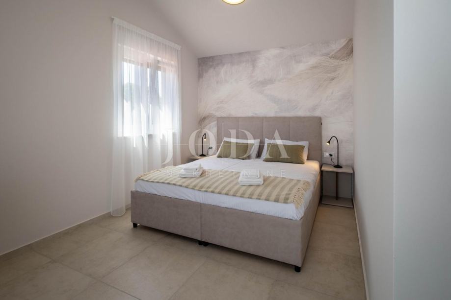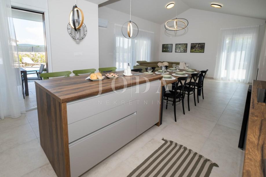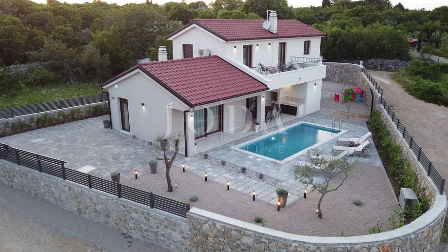 U mirnom dijelu unutrašnjosti otoka Krka prodaje se villa površine 160 m2, sagrađena na parceli od 636 m2. Stambeni dio ville obuhvaća prizemlje i kat. U prizemlju je ulazni hodnik, spavaća soba s kupaonicom, kuhinja s blagovaonom i dnevnim boravkom, wc i spremište. Dvije spavaće sobe i dvije kupaonice, kao i prostrana terasa se nalaze na prvom katu. Na okućnici se nalazi grijani bazen, uređeni vrt i natkrivena terasa s ljetnom kuhinjom. Sve prostorije u kući su klimatizirane, kuća ima video nadzor i alarm, a okućnica je uređena i ima automatsko navodnjavanje.