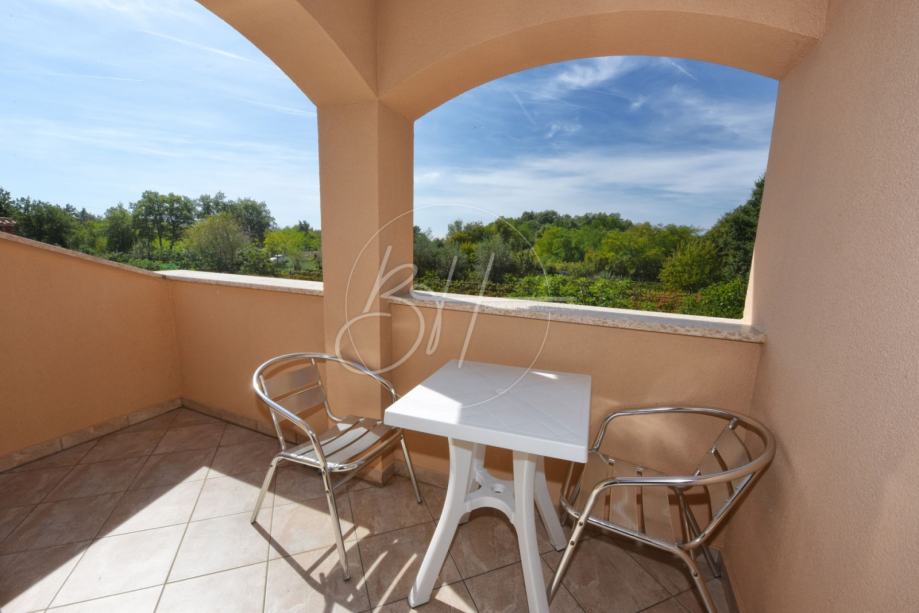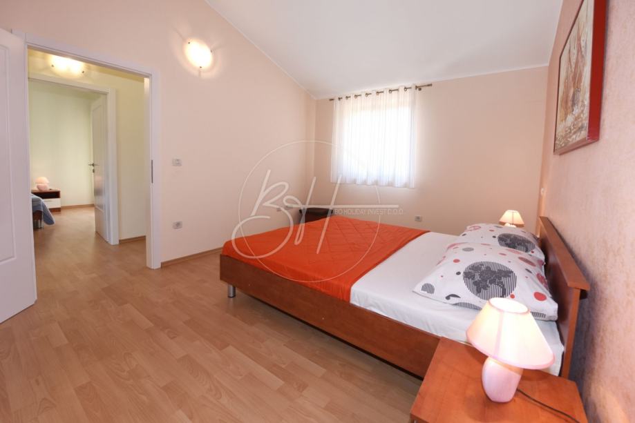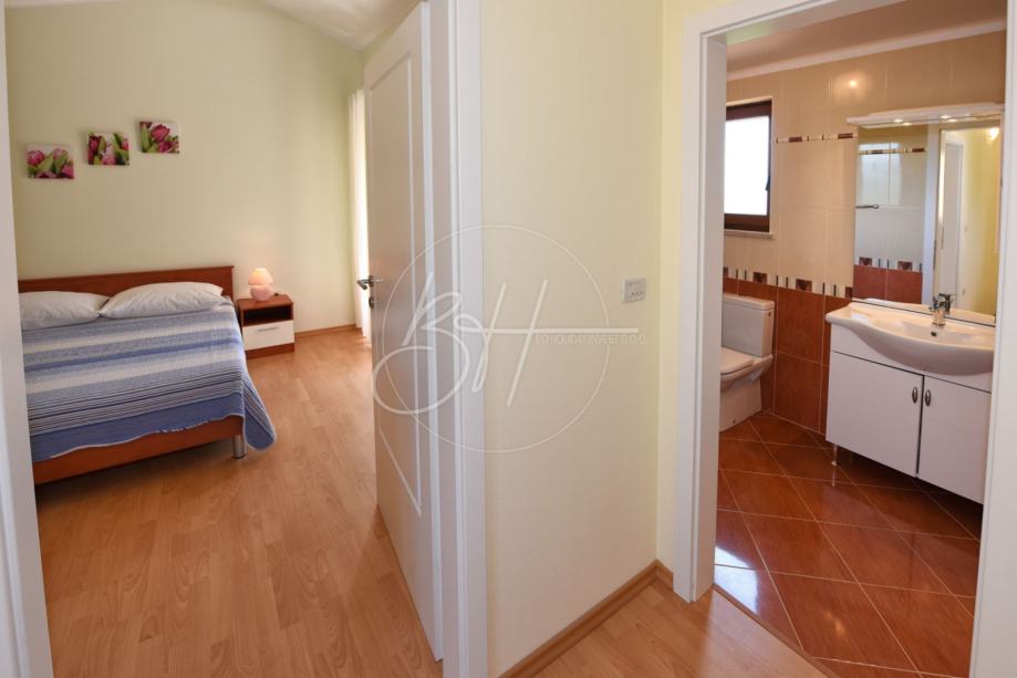 Na katu su dvije spavaće sobe i dodatna kupaonica, a jedna od soba ima izlaz na balkon s pogledom na mirnu prirodu i zelenilo.
