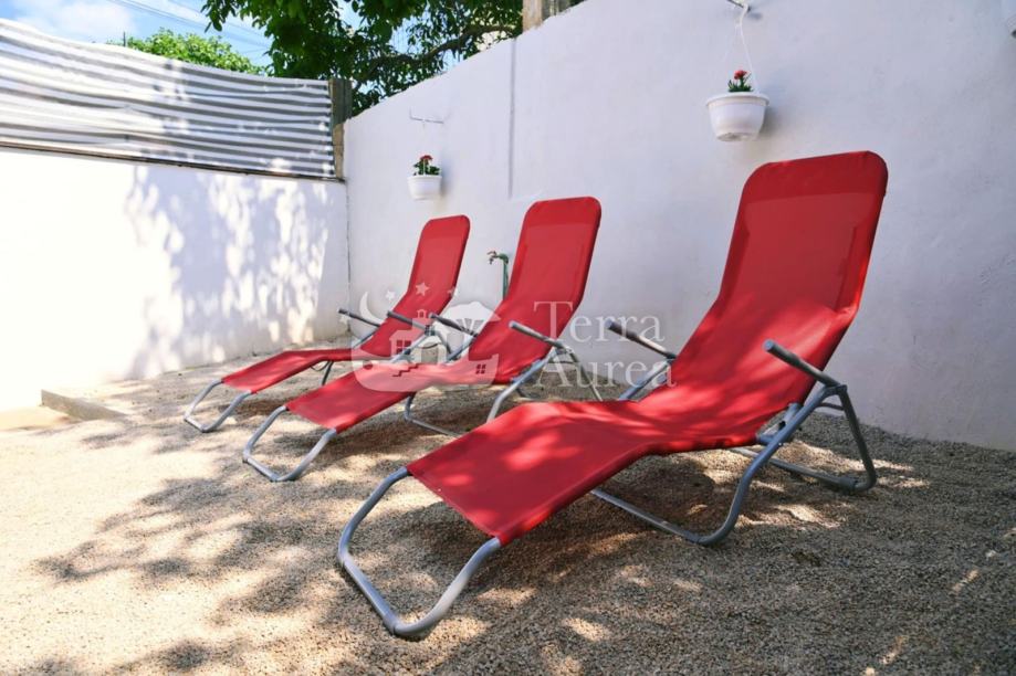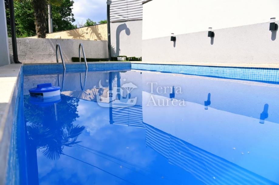 Na okućnici površine 300 m2 nalazi se privatni bazen sa sunčalištem, idealan za opuštanje i uživanje. Uz to, osiguran je i prostrani parkirni prostor za više vozila.