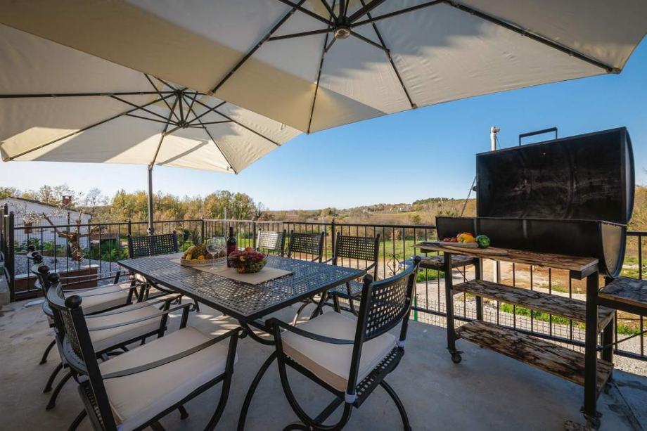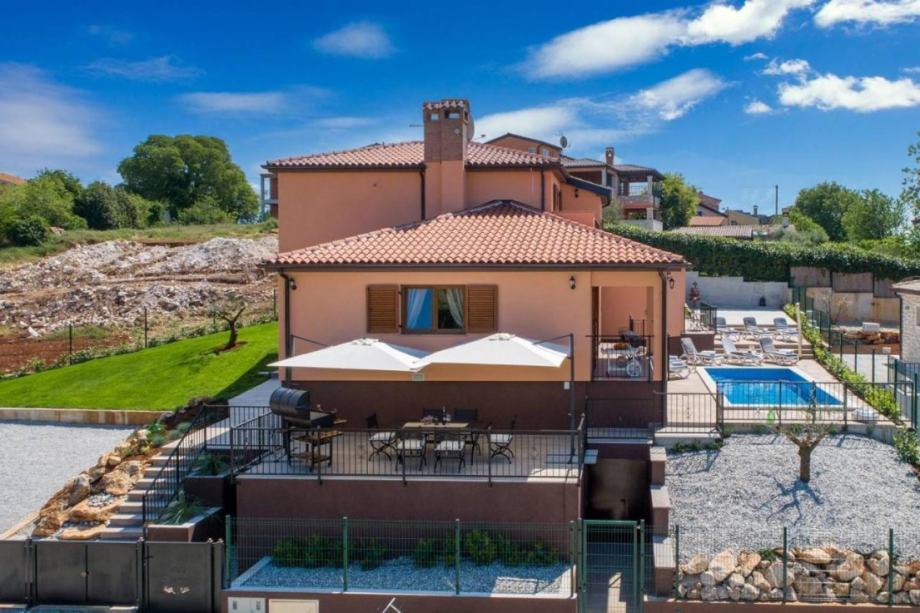Ispred kuće se nalazi velika sunčana terasa sa bazenom i vanjskim tušem, a u stražnjem dijelu terasa ima natkriveni dio s roštiljem i garniturom za sjedenje.