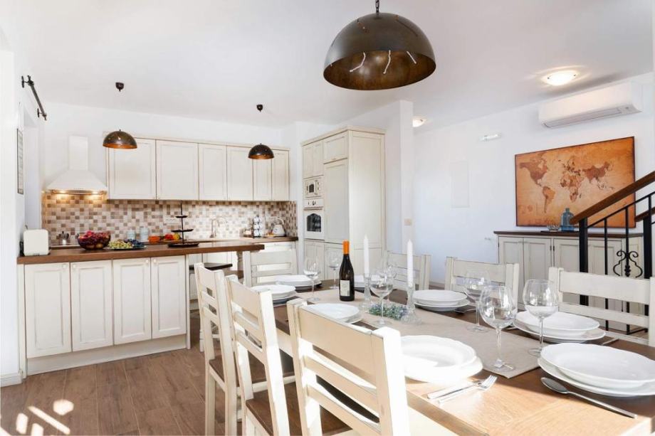 U prizemlju se nalaze ulazni prostor, dnevni boravak s kuhinjom i blagovaonom, dvije spavće sobe, svaka sa svojom privatnom kupaonicom, te WC za goste. Iz boravka postoji izlaz na natkrivenu terasu.