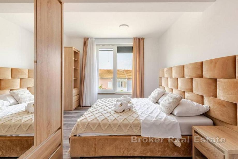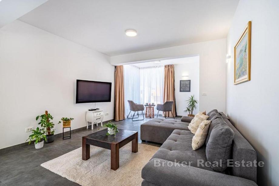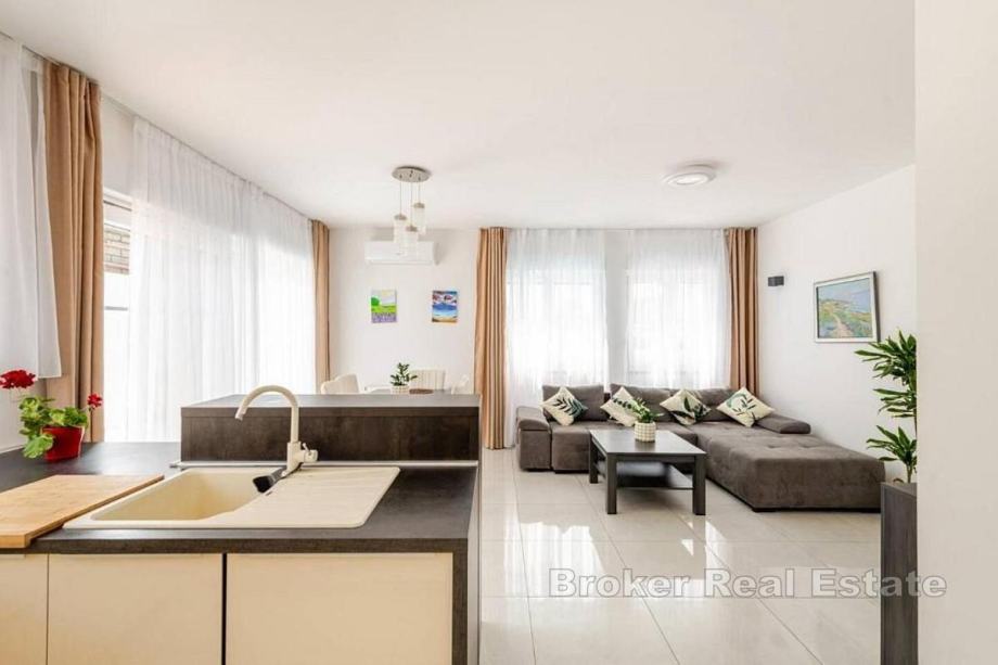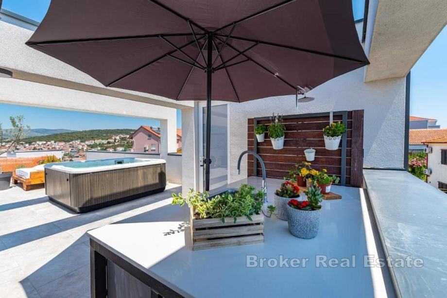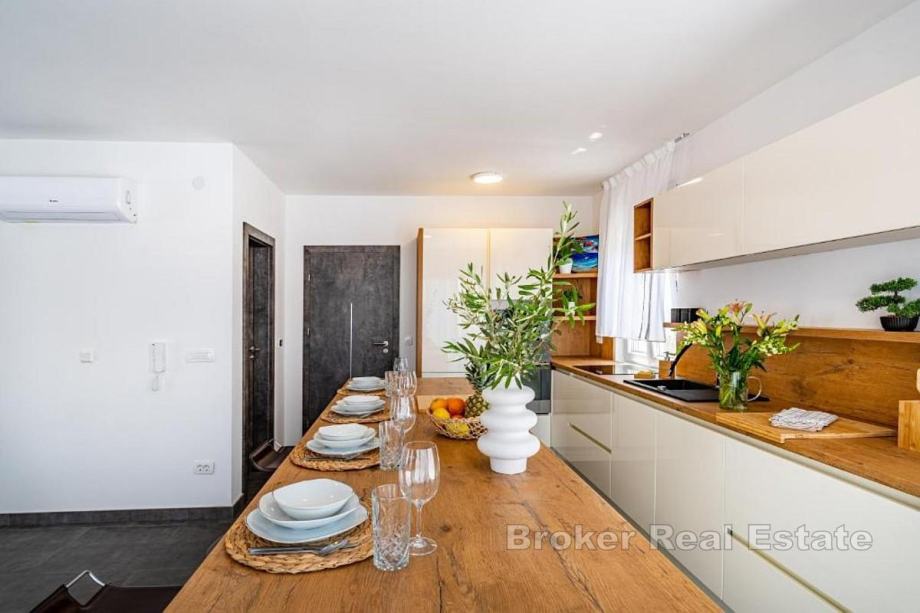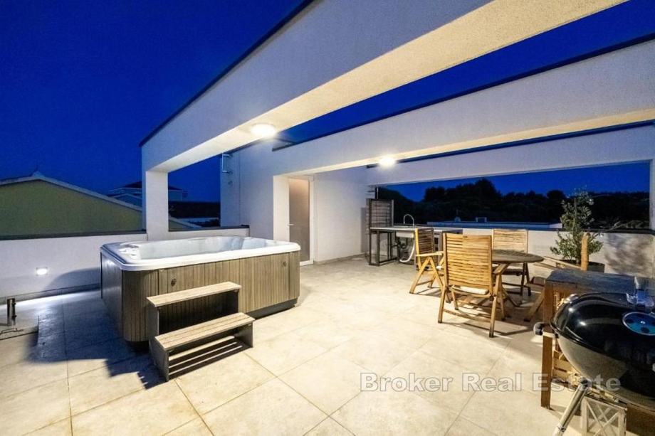 Kuća se sastoji od dva odvojena stana povezana unutrašnjim stepenicama, krovne terase s predivnim pogledom i spa zonom, vanjskog parkinga te bazena.