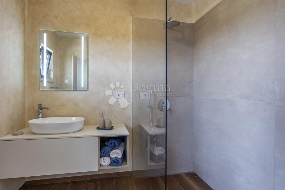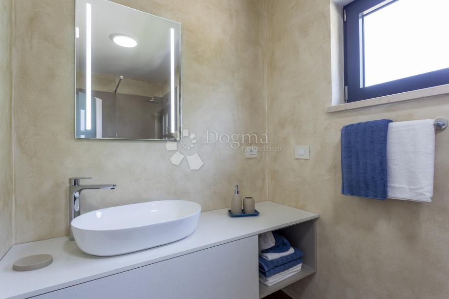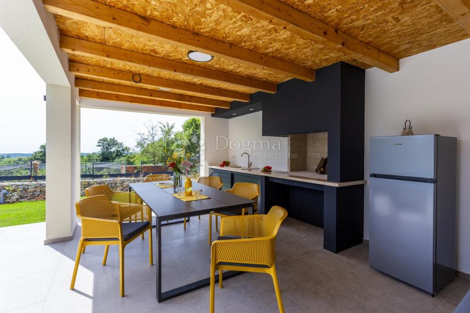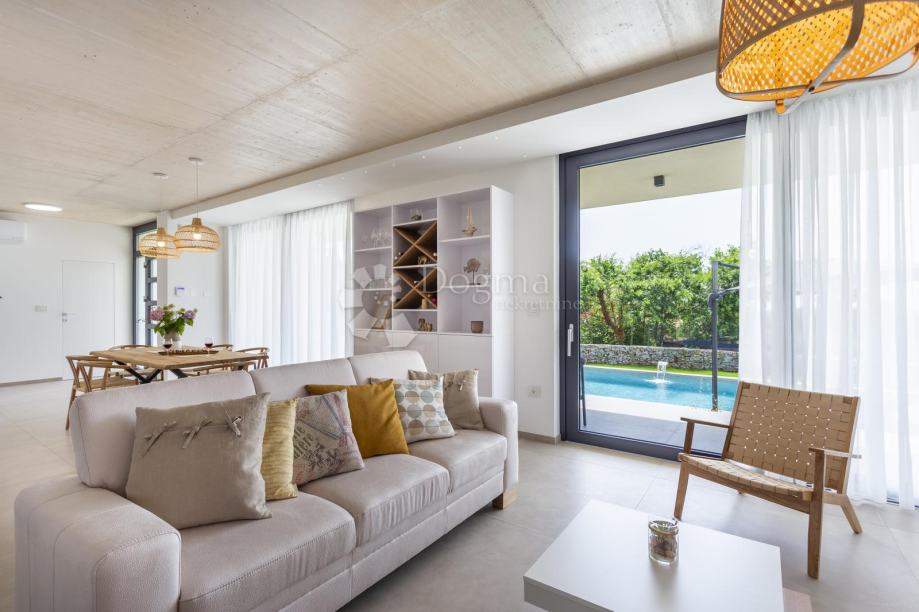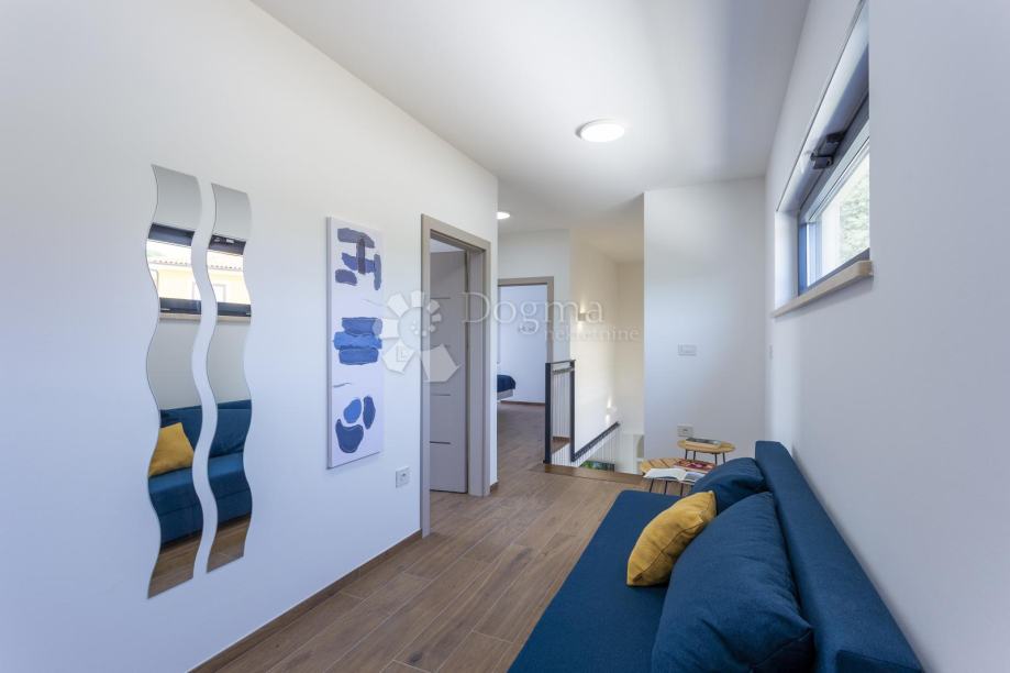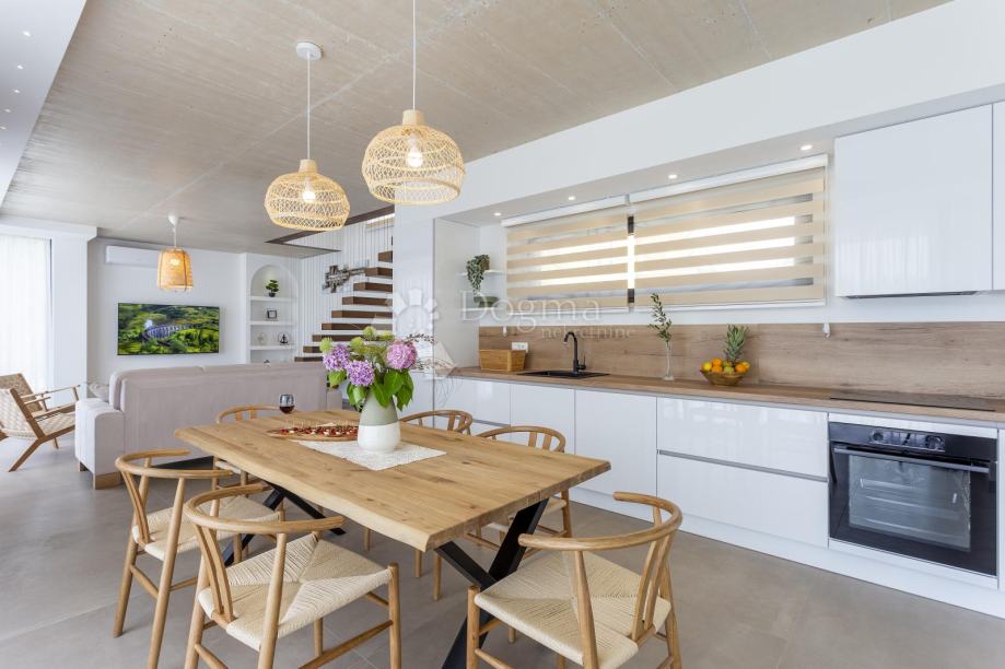 Prekrasna villa sagrađena 2024.godine, površine 208m2, elegantnog dizajna okrenuta prema jugozapadu. Prizemlje nekretnine sastoji se od dnevnog boravka s kuhinjom i blagovaonicom, toaleta, spremišta, kotlovnice i natkrivene terase te pomoćnog objekta sa kaminom u prizemlju. Na katu su tri spavaće sobe s kupaonicama i balkonom.