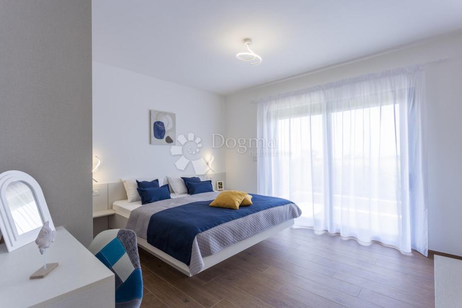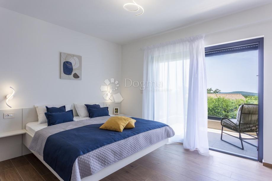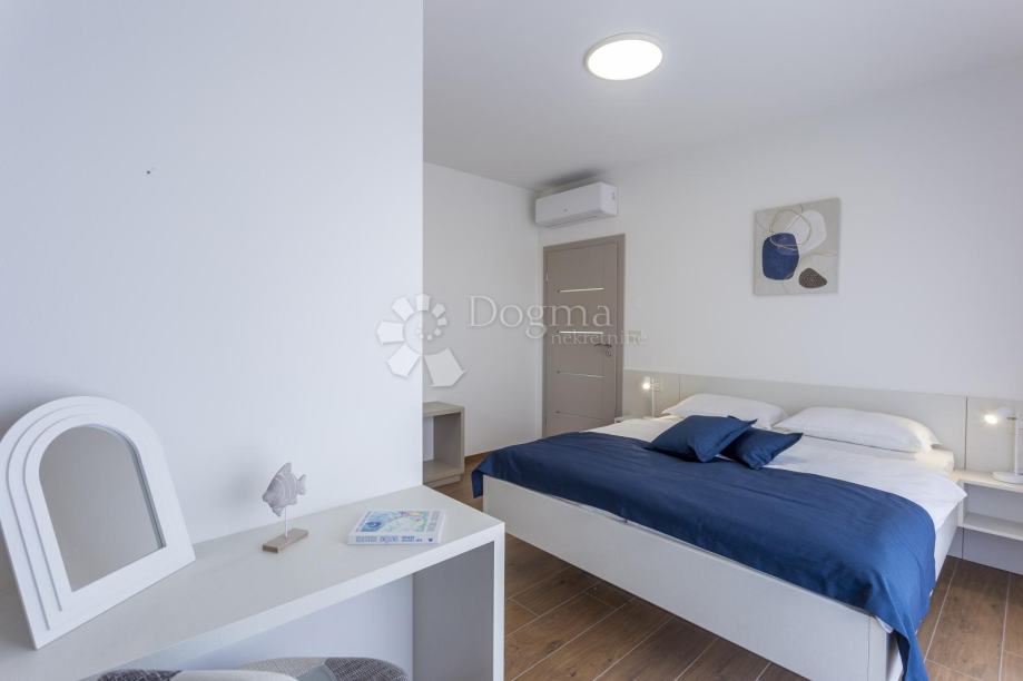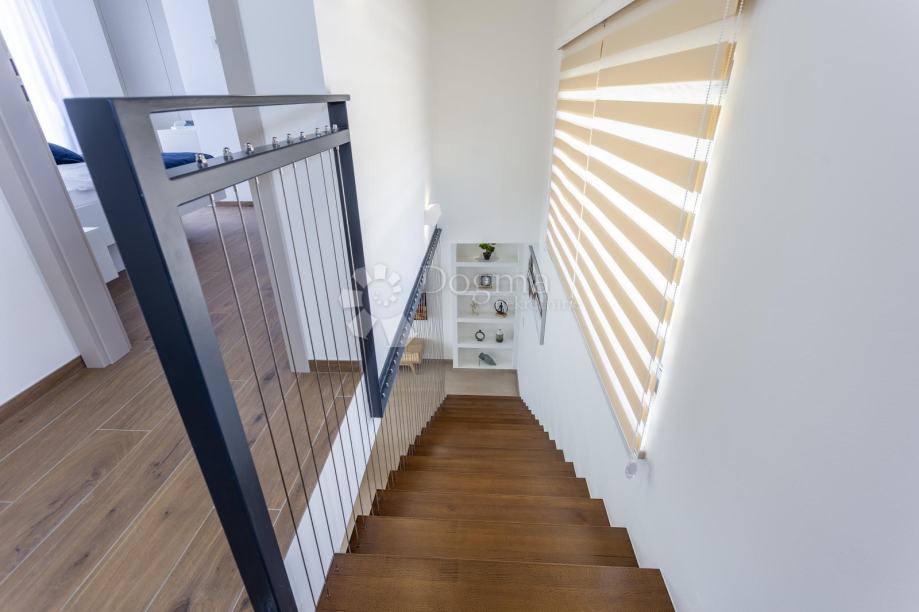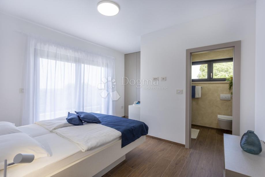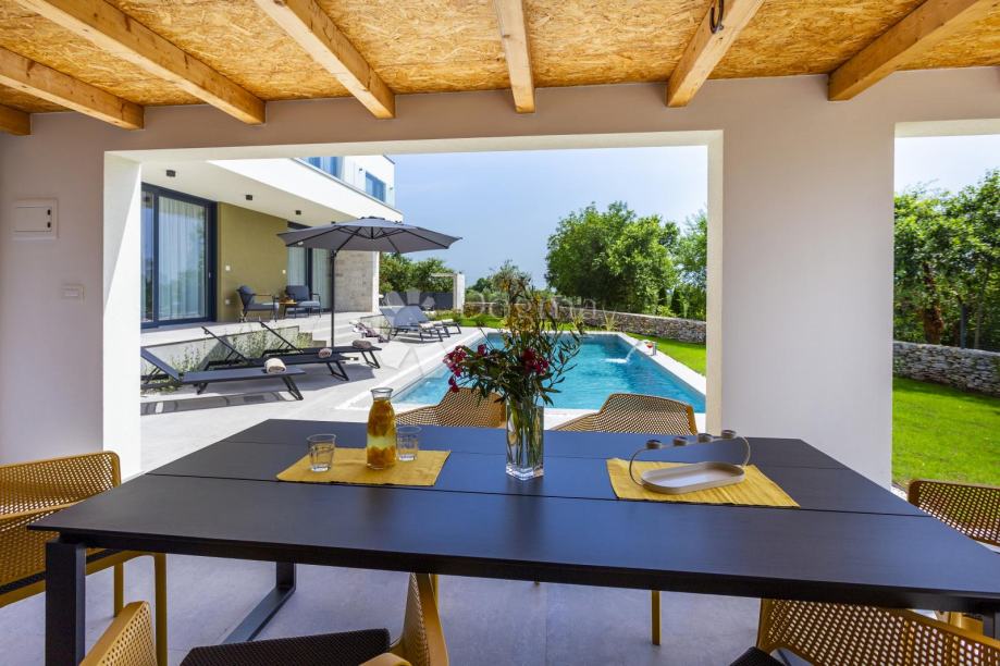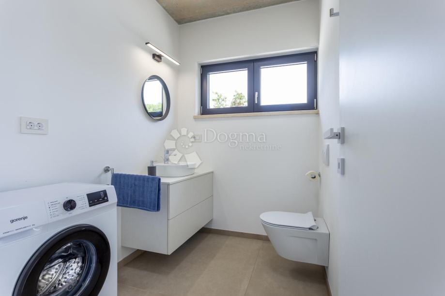Prekrasna villa sagrađena 2024.godine, površine 208m2, elegantnog dizajna okrenuta prema jugozapadu. Prizemlje nekretnine sastoji se od dnevnog boravka s kuhinjom i blagovaonicom, toaleta, spremišta, kotlovnice i natkrivene terase te pomoćnog objekta sa kaminom u prizemlju. Na katu su tri spavaće sobe s kupaonicama i balkonom.