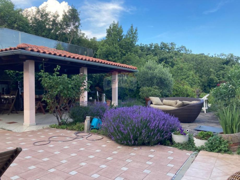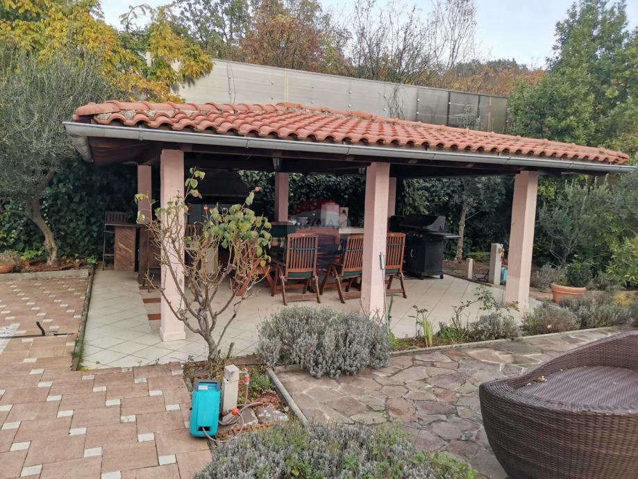 Okućnica s bazenom površine 32m2 je uređena i održavana, sa zasađenim voćkama i meditaranskim biljem. Tu je još i vanjska natkrivena terasa za razna druženja uz roštilj.