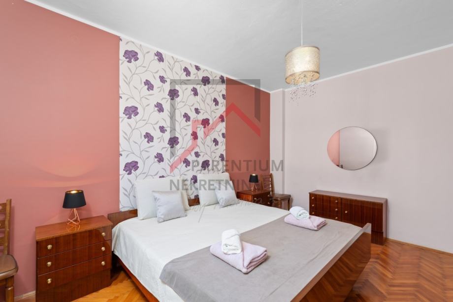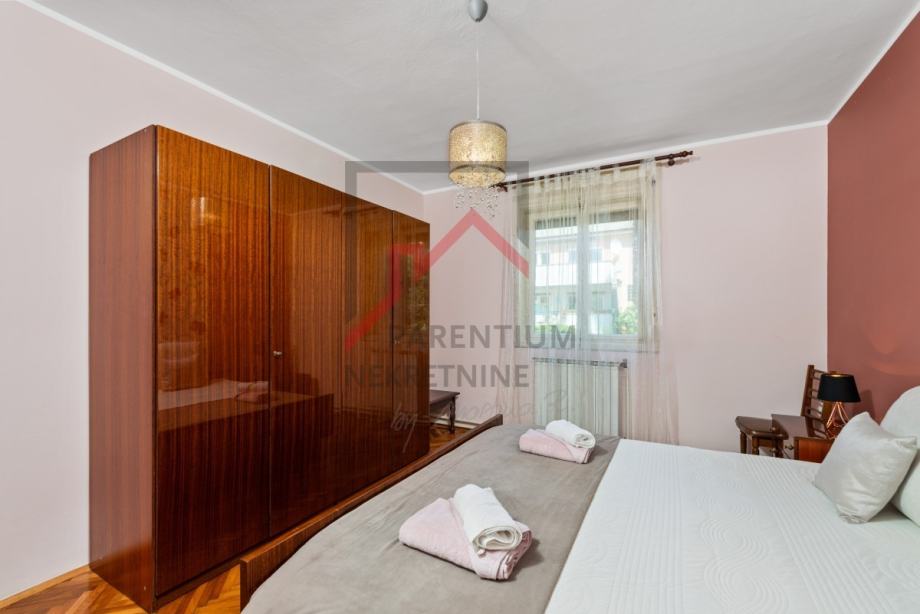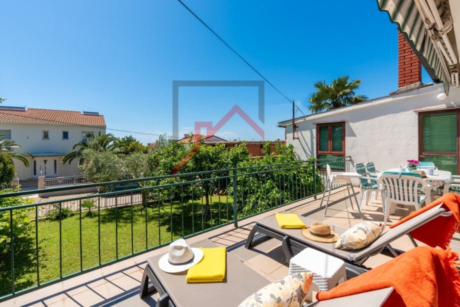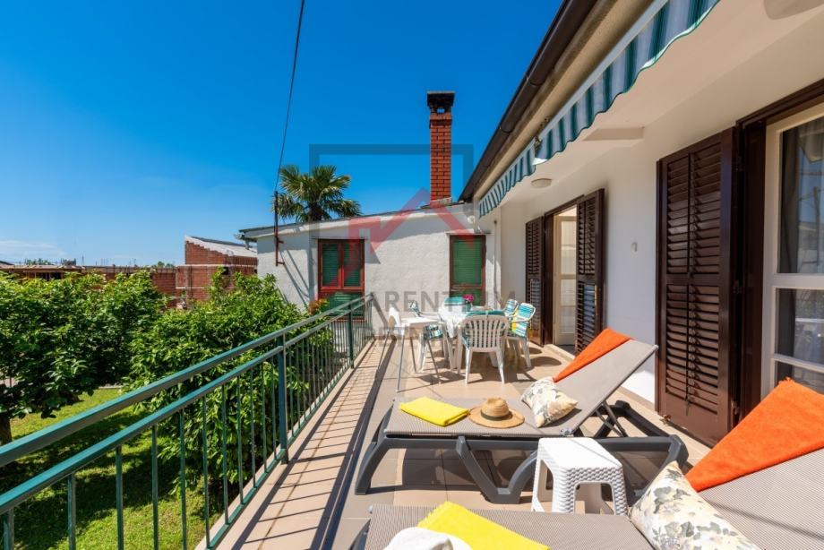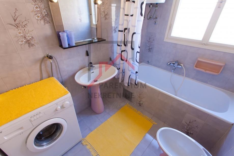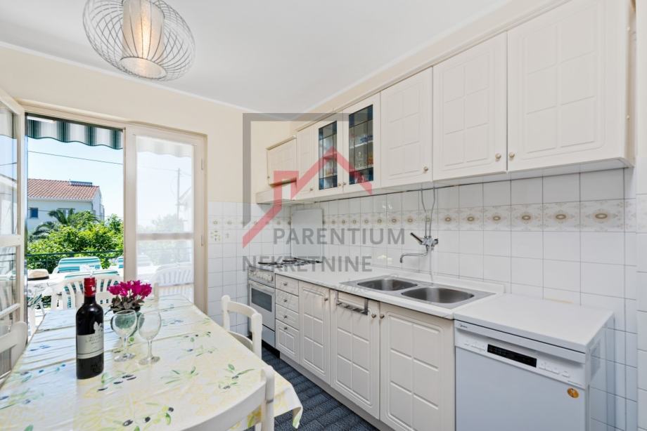 Na prvom katu se nalazi drugi stan sa tri spavaće sobe, kuhinja sa blagovaonom, dnevni boravak, spremište i lijepa terasa sa pogledom na more. Stan na prvom katu površine je 116m2.