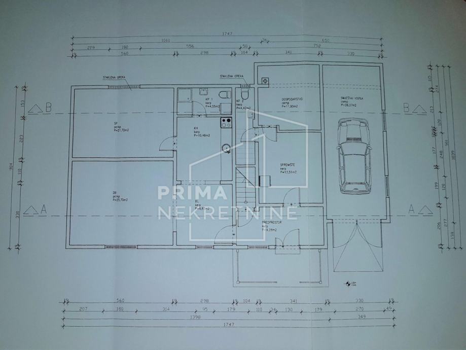Tlocrtno kuća zauzima 165 m2, a sastoji se od dvije etaže i to prizemlja i potkrovlja. Površina prizemne etaže je 140 m2, a sastoji se od prostranog dnevnog boravka povezanog s blagovaonicom i kuhinjom, spavaće sobe, kupaonice, gospodarske sobe, radne prostorije, garaže i pretprostora.