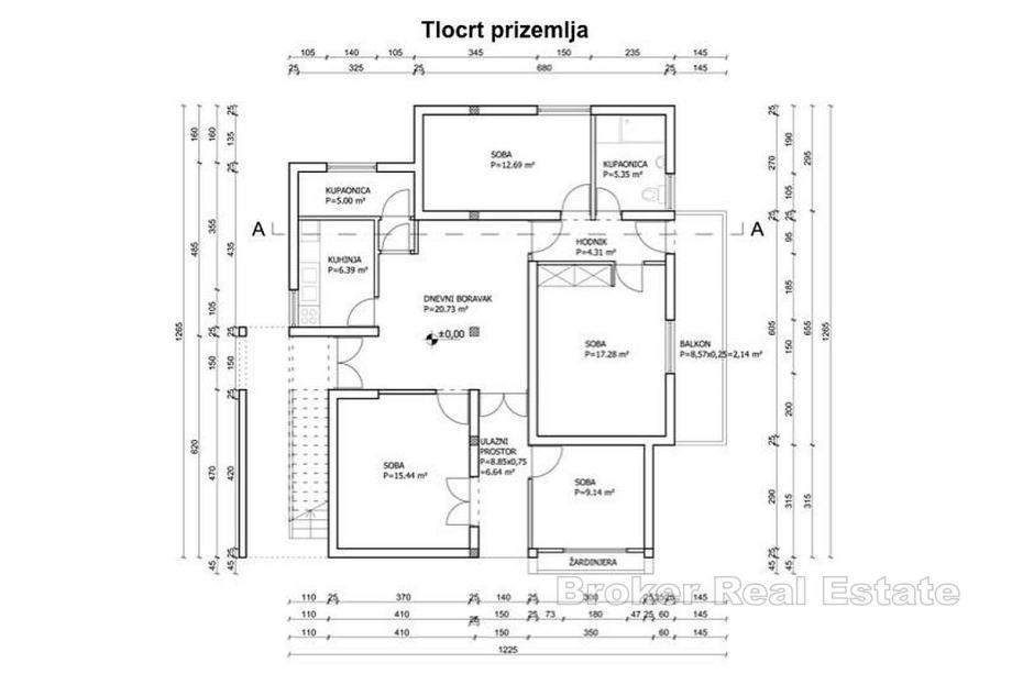 U prizemlju se nalazi 4-sobni stan površine 125 m2 sa četiri spavaonice (17, 15, 13 i 16 m2), velikim dnevnim boravkom i blagovaonicom, kuhinjom, 2 kupaonice, natkrivenim balkonom od 9 m2 i velikom terasom od 40 m2.