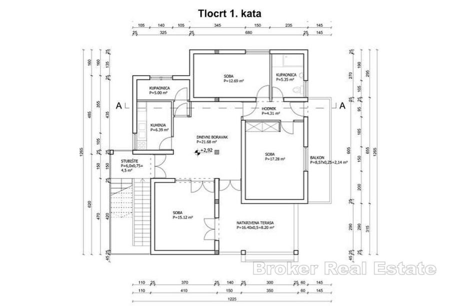Prvi kat je identičan prizemlju, osim što je umjesto male sobe od 16 m2 nalazi proširena terasa.