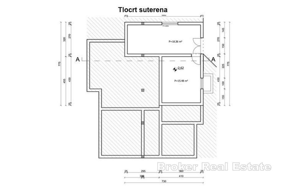 U suterenu je jednosoban stan od 42 m2, koji se sastoji od kuhinje, kupaonice i spavaće sobe od 22 m2.