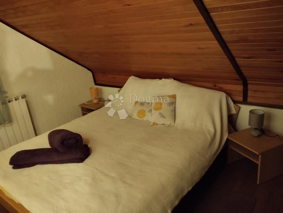 Na gornjoj etaži smještene su još dvije spavaće sobe, radna soba te kupaonica s kadom, što kuću čini prikladnom i za veće obitelji ili goste. Grijanje je riješeno putem centralnog grijanja na struju, uz dodatni kamin na drva u dnevnom boravku i kalijevu peć, što omogućuje ugodan boravak tijekom zimskih mjeseci. Kuća ima drvenu stolariju s dvostrukim ISO staklom, noviju fasadu obloženu termoizolacijom te krov u dobrom stanju.