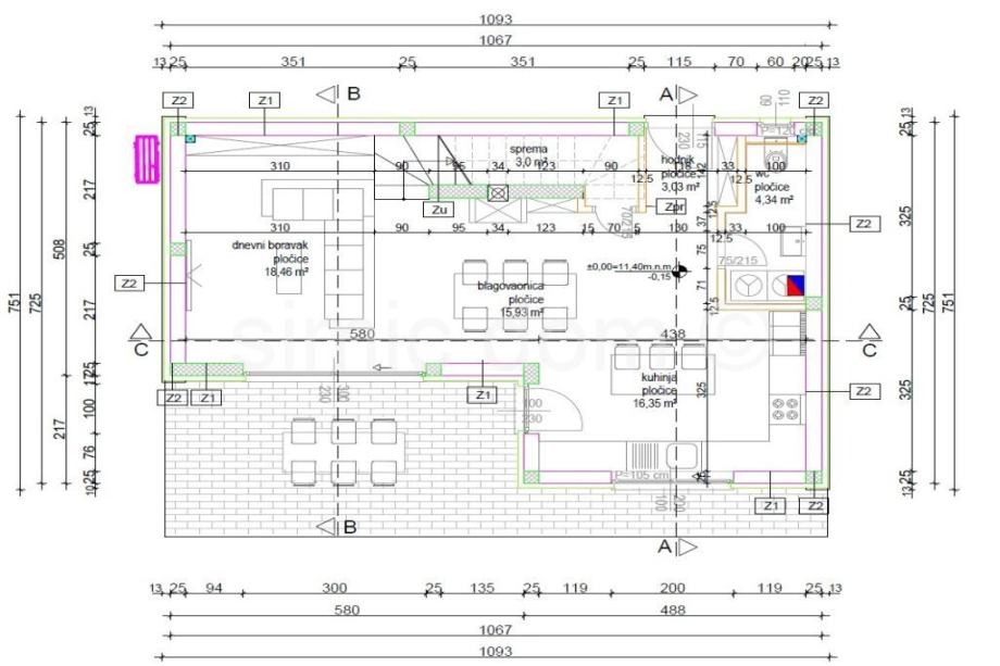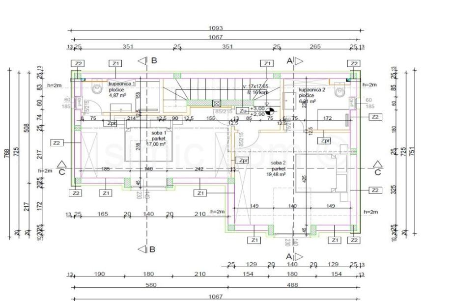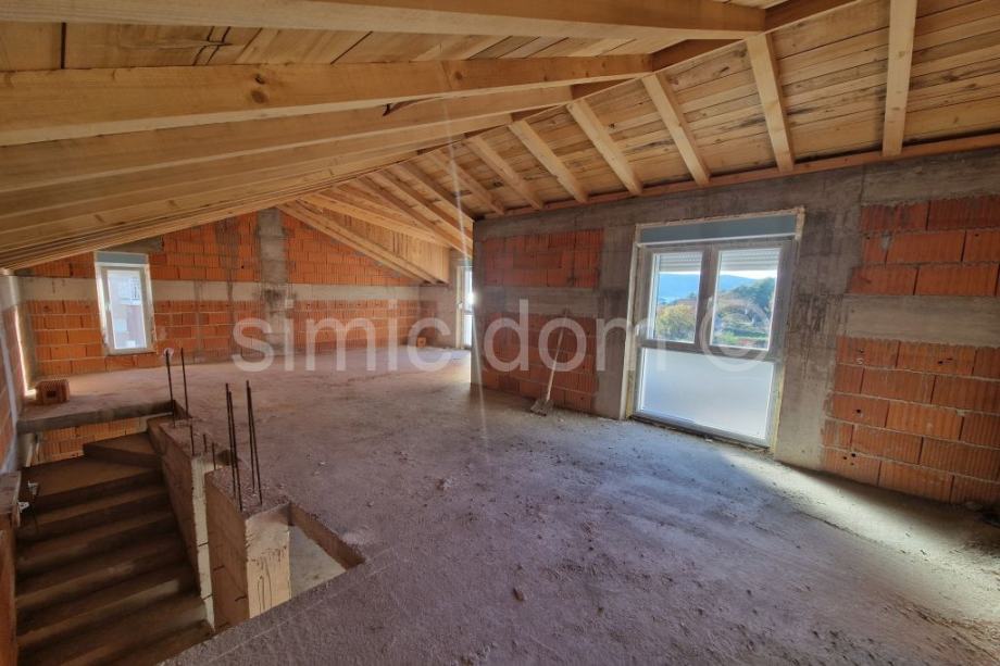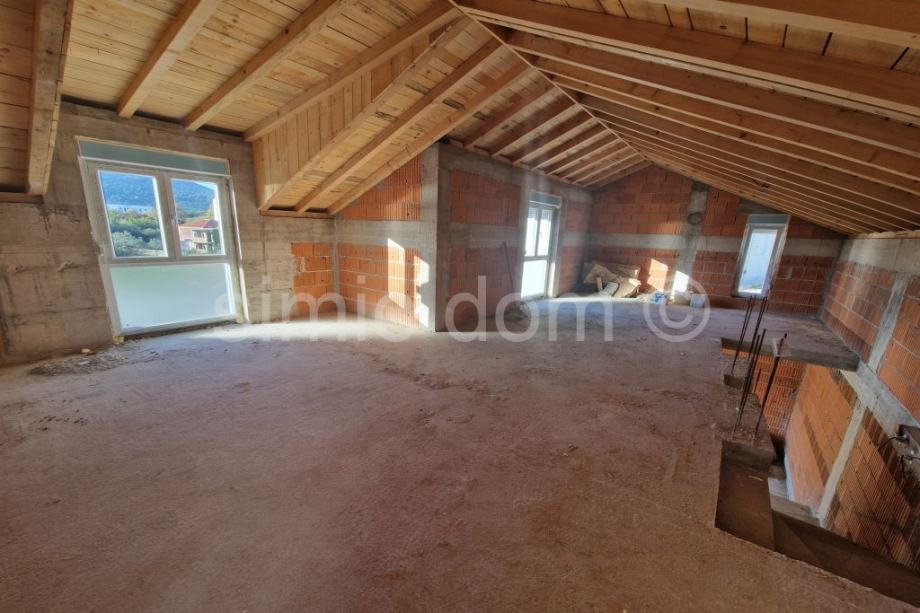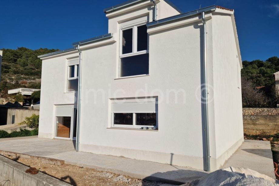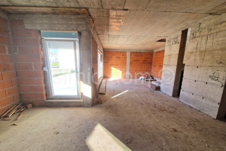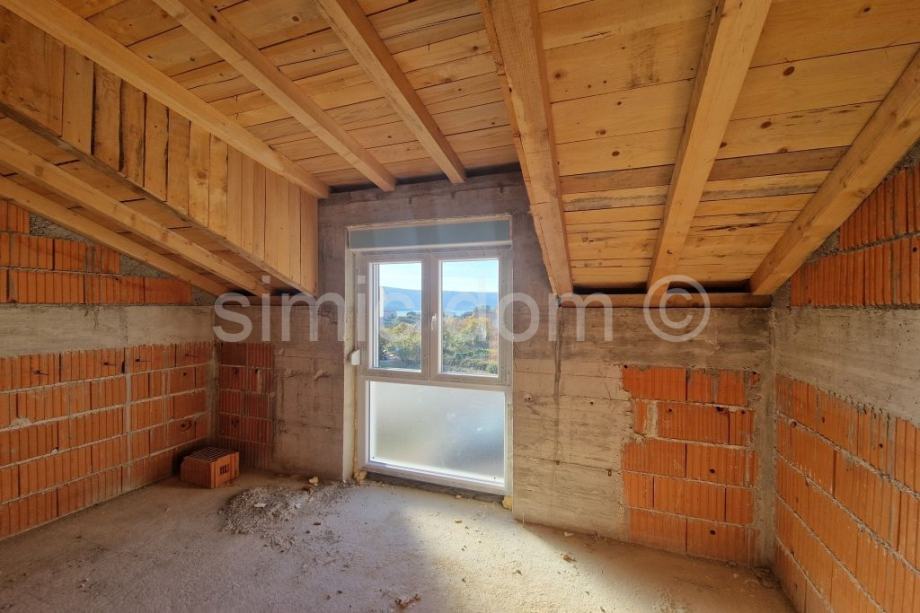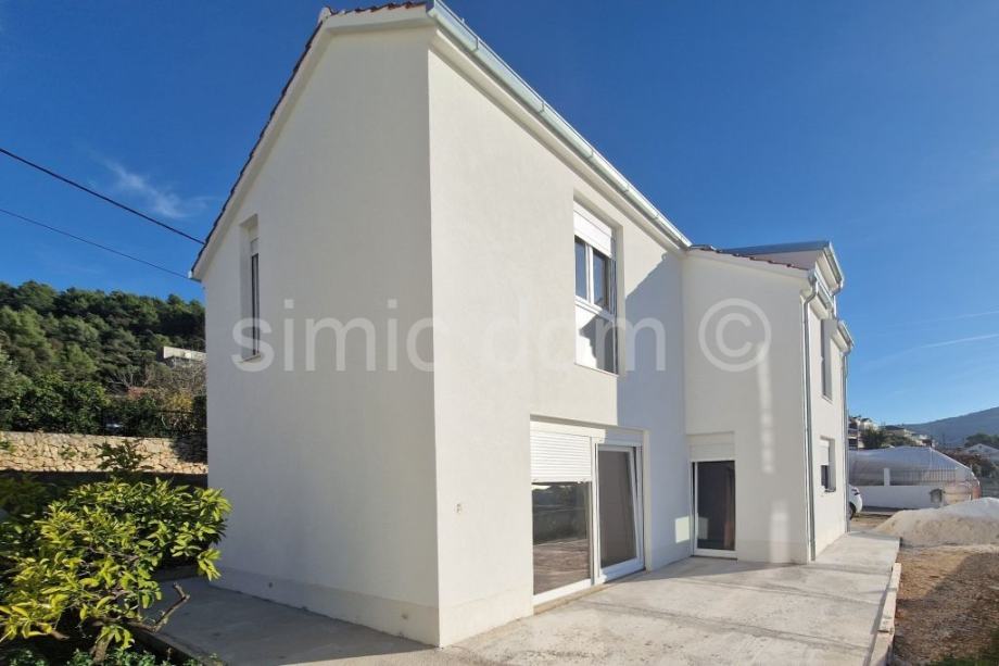 Na prodaju je samostojeća kuća smještena u mirnom mjestu svega 5 minuta vožnje od Trogira. Kuća ima ukupnu bruto površinu od 111 m2 i sastoji se od dvije etaže. U prizemlju je smješten ulazni prostor, sprema, kupaonica, te kuhinja sa blagovaonicom i dnevnim boravkom otvorenog koncepta iz koje se izlazi na popločeni dio dvorišta. Na prvom katu nalaze se dvije prostrane spavaće sobe koje imaju i malo pogleda na more, i svaka ima vlastitu kupaonicu. U sklopu parcele nalazi se parkirno mjesto za dva automobila te je planiran i bazen od 22 m2. Kuću je potrebno dovršiti, a kupac nakon odabira materijala i finalnog izgleda ima mogućnost dogovoriti sa prodavateljem dovršetak radova. Građevinska dozvola je pravomoćna i sve komunalije, voda i struja su plaćene. Kuća se nalazi na odličnoj lokaciji nedaleko Trogira i Marine, u blizini je trgovina, a plaža je udaljena svega 250m tako da je odlična kako za život tako i za najam. Vlasništvo uredno.