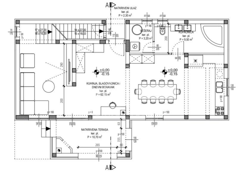 Prizemlje sadrži: blagovaonicu s kuhinjom i dnevnim boravkom (pov. 62.15 m2), kupaonicu (pov. 9.50 m2), vešeraj/praonicu rublja (pov. 3.20 m2), te natkrivenu terasu (pov. 10.70 m2) na kojoj se nalazi kameni grill/roštilj. U praonici se nalazi Ariston bojler (zapremine 240 litara) s dizalicom topline na koji je moguće spojiti centralno podno grijanje.