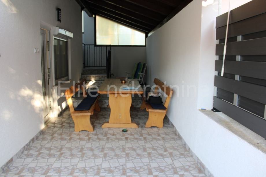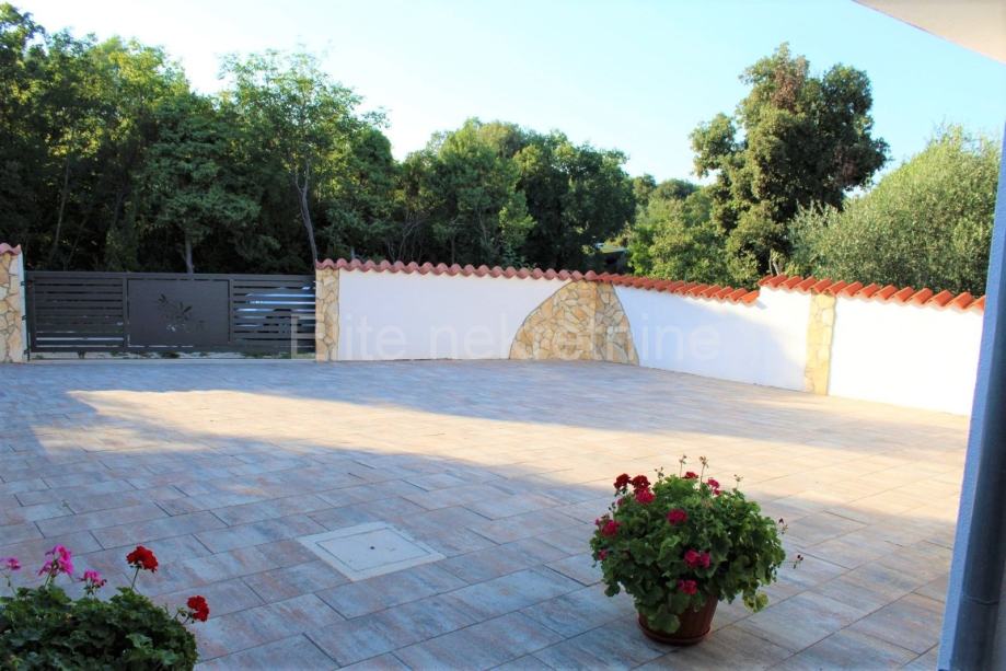 Kuća ima veliki ograđeni parking za više automobila, koji se može koristiti dio parking a dio kao terasa, natkrivenu terasu s drvenim klupama i stolom za druženje s društvom ili odmor u hladovini i ostavu ispod stepenica koje vode na prvi kat kuće