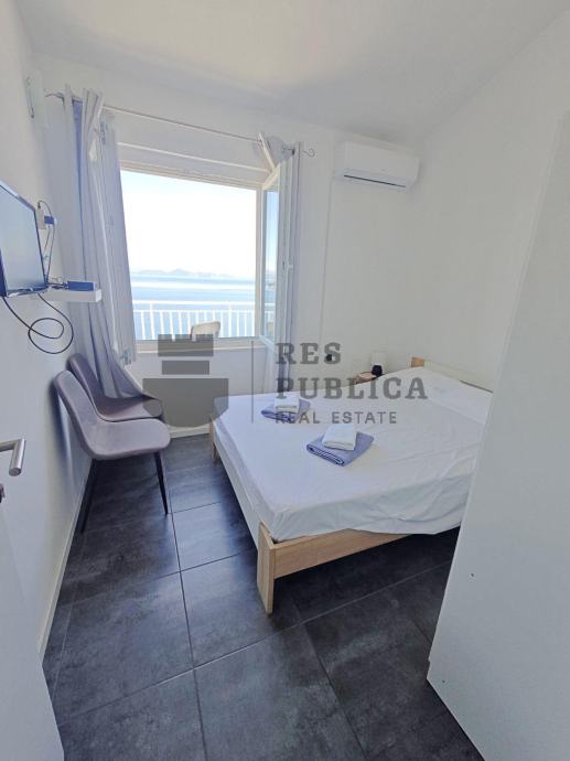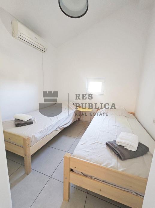 Ova elegantna kuća smještena je u drugom redu do mora te se sastoji od prizemlja i kata, ukupne površine 120 m2. Prizemlje nudi dvosobni stan, dok se na katu nalazi trosobni stan. Osim unutrašnjeg komfora, kuća oduševljava i prekrasnim pogledom te kaskadnim vrtovima koji dodaju poseban šarm. Okružena je prirodom na parceli od 426 m2, obilujući borovom šumom koja osigurava potpunu privatnost.
