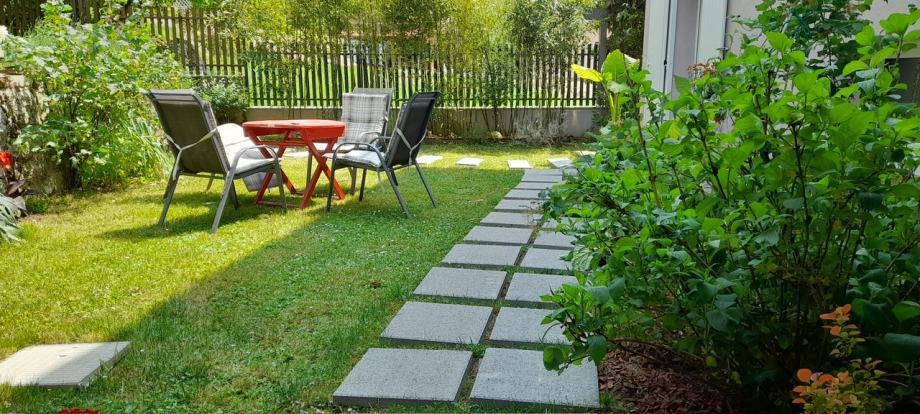 Na ulazu u vrt ozelenjena nadstrešnica za dva auta.